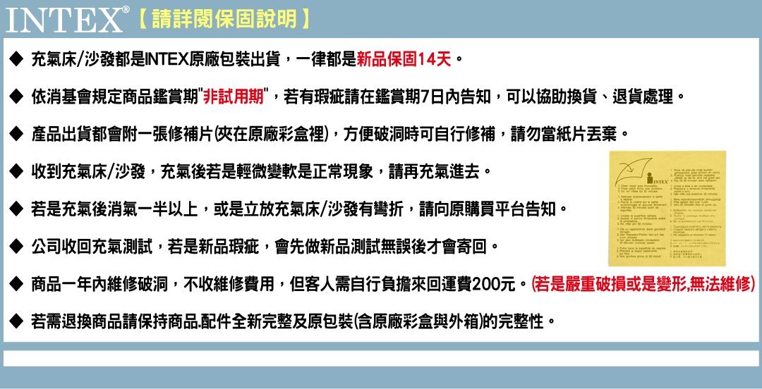 ◆ 保固:新品保固14天,商品若有瑕疵,請於鑑賞期7天內反映,一經充氣使用恕無法辦理退貨。