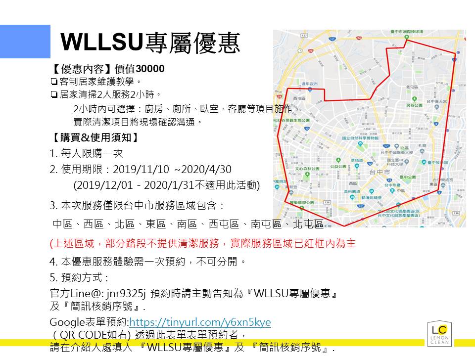 Google表單預約:https://tinyurl.com/y6xn5kye(QR CODE如右) 透過此表單表單預約者,請在介紹人處填入 『WLLSU專屬優惠』及 『簡訊核銷序號』.