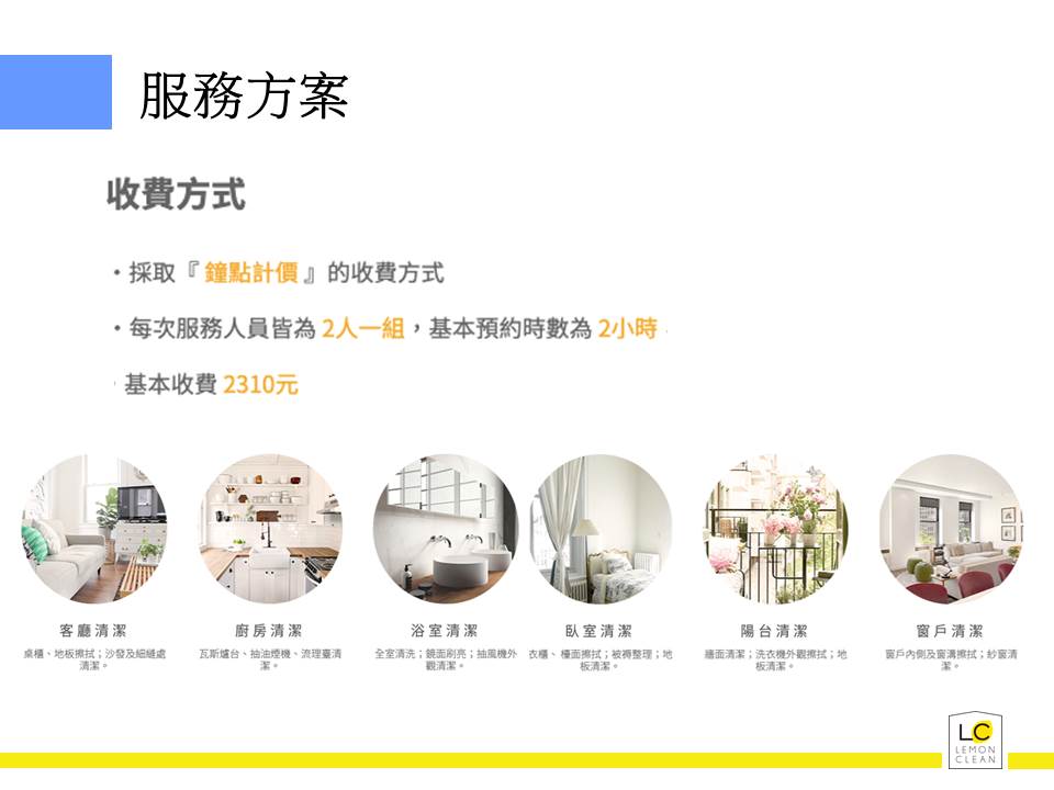 2小時內可選擇:廚房、廁所、臥室、客廳等項目施作,實際清潔項目依現場專人溝通確認。