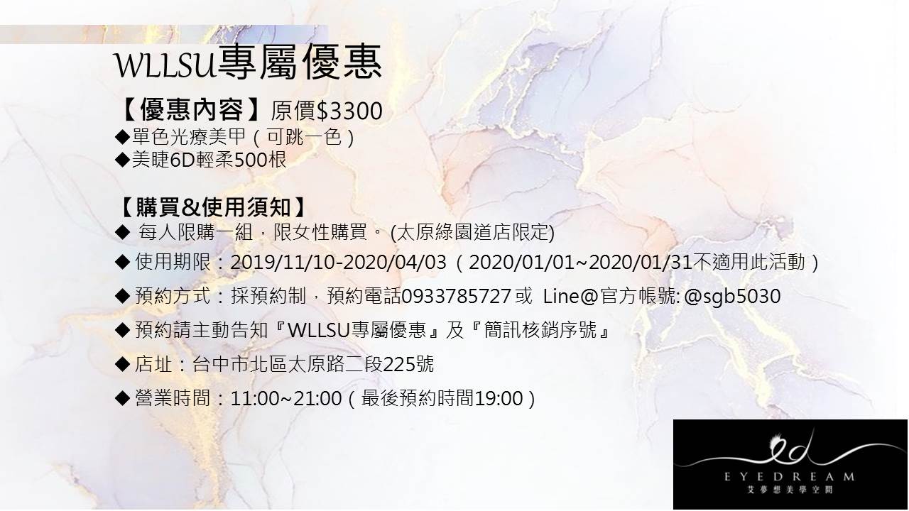 預約時請主動告知為『WLLSU專屬優惠』及『簡訊核銷序號』