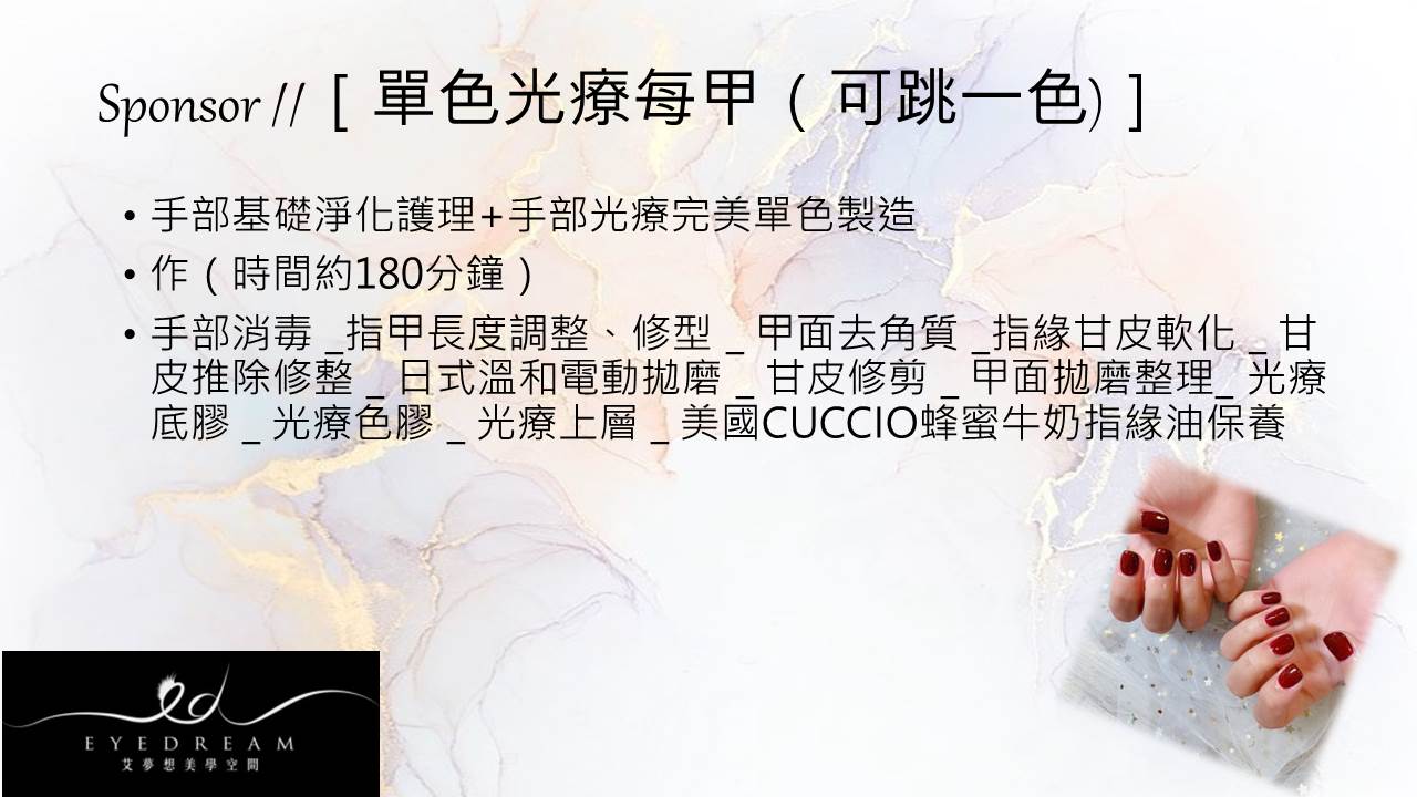 手部消毒 _指甲長度調整、修型 _ 甲面去角質 _指緣甘皮軟化 _ 甘皮推除修整 _ 日式溫和電動拋磨 _ 甘皮修剪 _ 甲面拋磨整理_ 光療底膠 _ 光療色膠 _ 光療上層 _ 美國CUCCIO蜂蜜牛奶指緣油保養