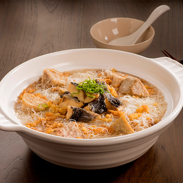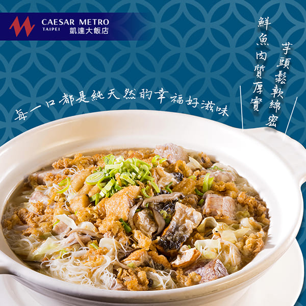 經典台灣酒家菜的菜式之一,鮮魚肉質厚實、加上芋頭的綿密口感,在米粉湯中都耐久煮,在台菜宴席中,持續加熱的米粉湯鍋便成了酒酣耳熱的賓客暖胃醒酒的必吃佳餚。位於萬華中心區兩年前甫開幕的凱達大飯店中餐廳「家宴」,行政主廚戴于益將擅長的江浙及廣東菜手藝融入經典台菜,融合的創意又能品嚐到濃濃的古早味。