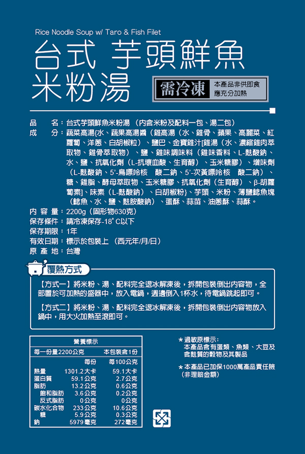 商品主成分:蔬菜高湯、芋頭、米粉、薄鹽鯰魚塊、蛋酥、蒜苗、油蔥酥、蒜酥