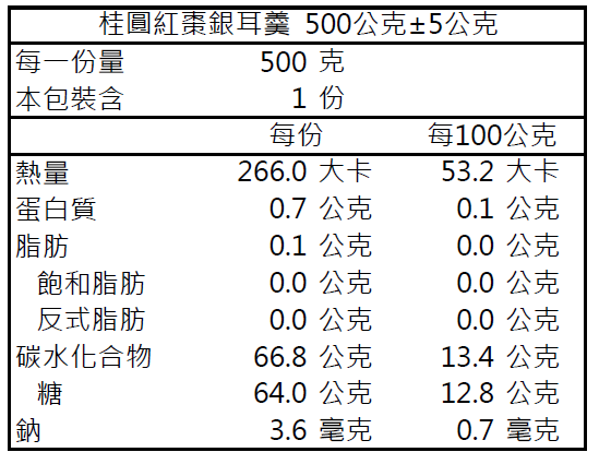 內容物成分: 桂圓、紅棗、白木耳、黑糖、細砂糖、水
