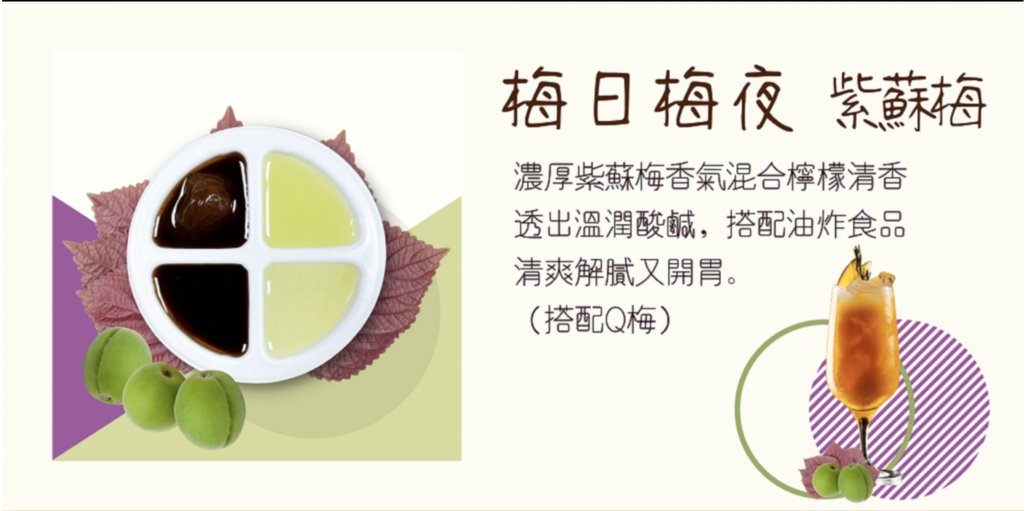 -紫蘇梅(梅日梅夜):濃厚紫蘇梅香氣混合檸檬清香透出溫潤酸鹹,搭配油炸食品清爽解膩又開胃。(搭配Q梅)