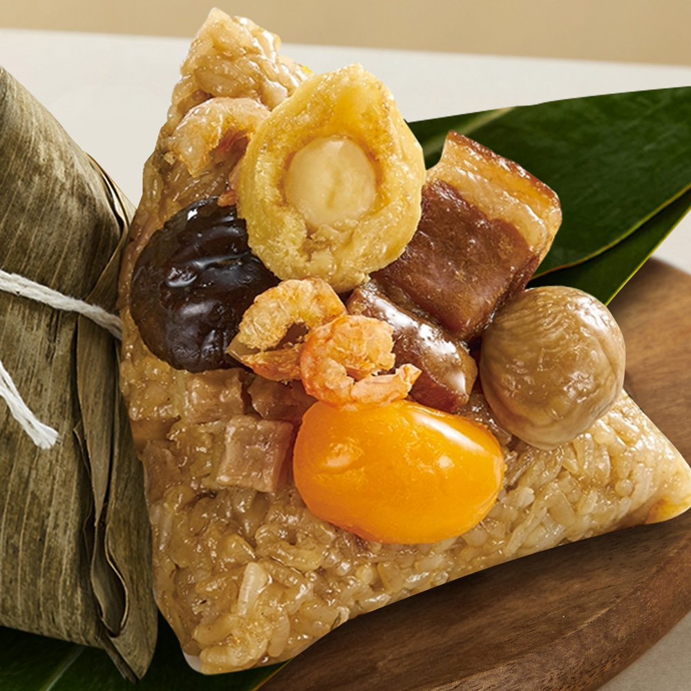 金賞軒榮登多年必比登,米香Q彈,特調滷汁鹹香爽口不油膩,搭配多種配料,佐以粽葉濃郁香氣,口感豐富,成就金賞軒經典鮑魚海味粽。