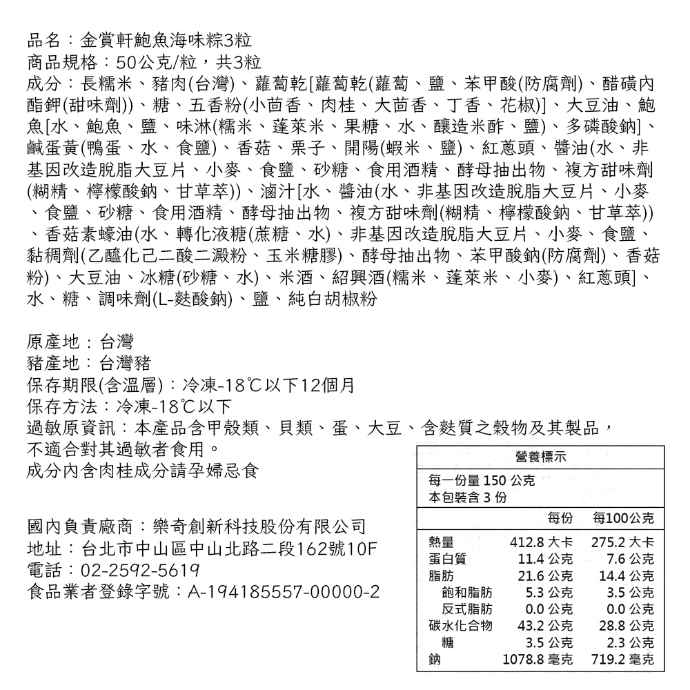 【金賞軒】鮑魚海味粽(3入) 2026/3/16