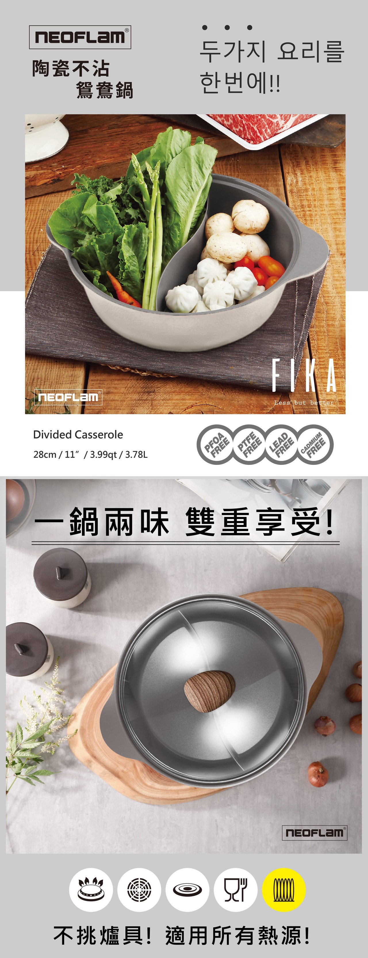 【NEOFLAM】陶瓷不沾鑄造28公分鴛鴦鍋含玻璃蓋-FIKA(IH適用)