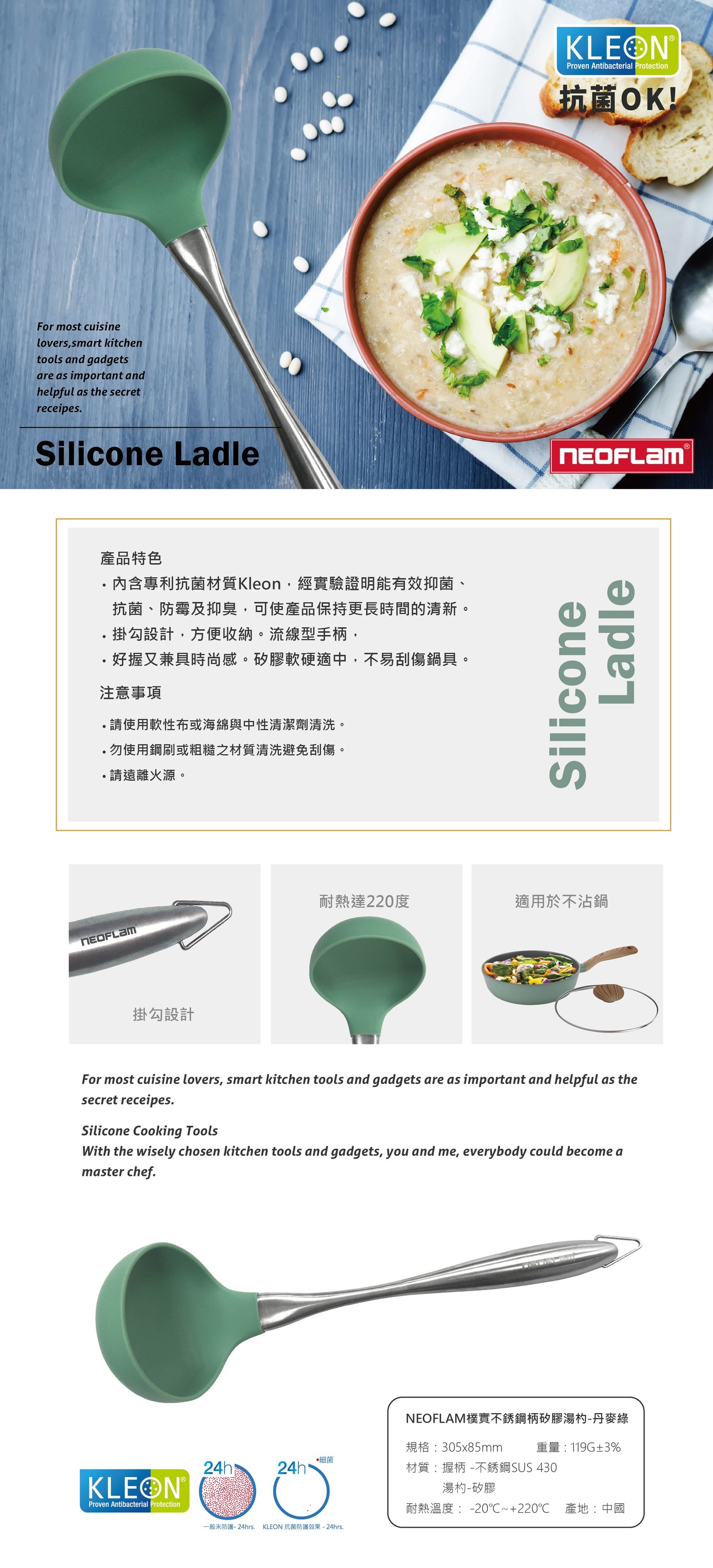 【NEOFLAM】樸實不銹鋼矽膠抗菌湯勺-丹麥綠