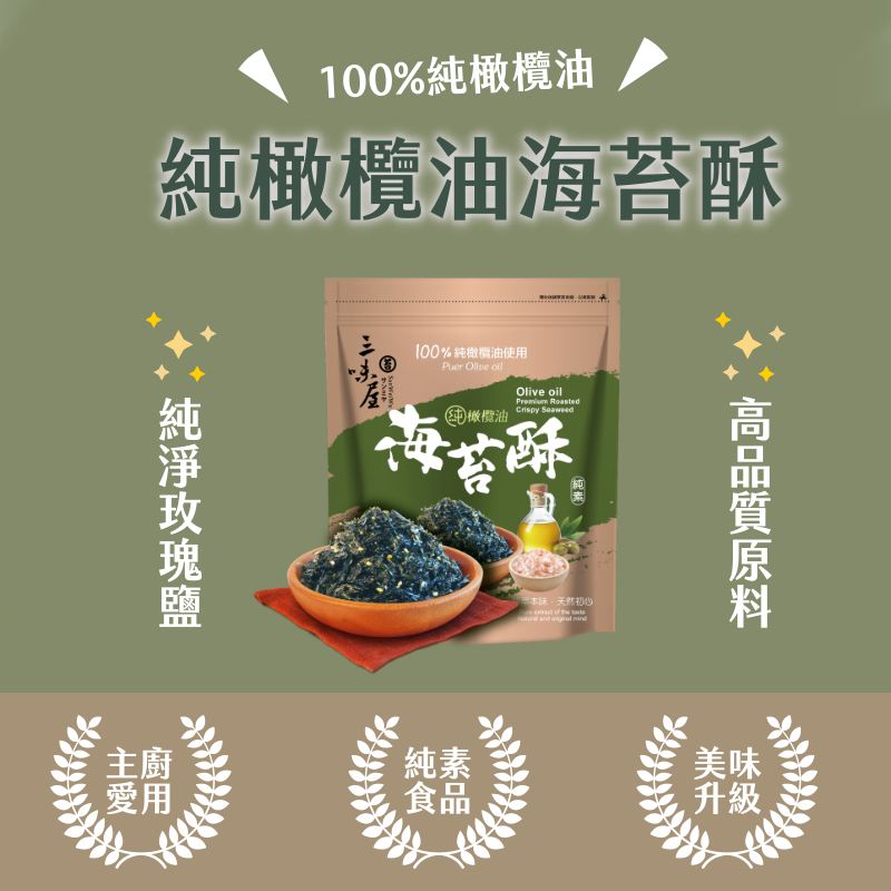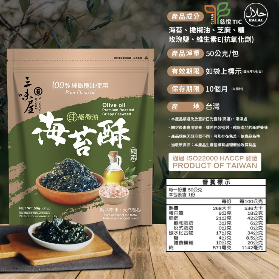 內含:【三味屋】100%純橄欖油海苔酥50g*1包(雙潔淨標章認證)