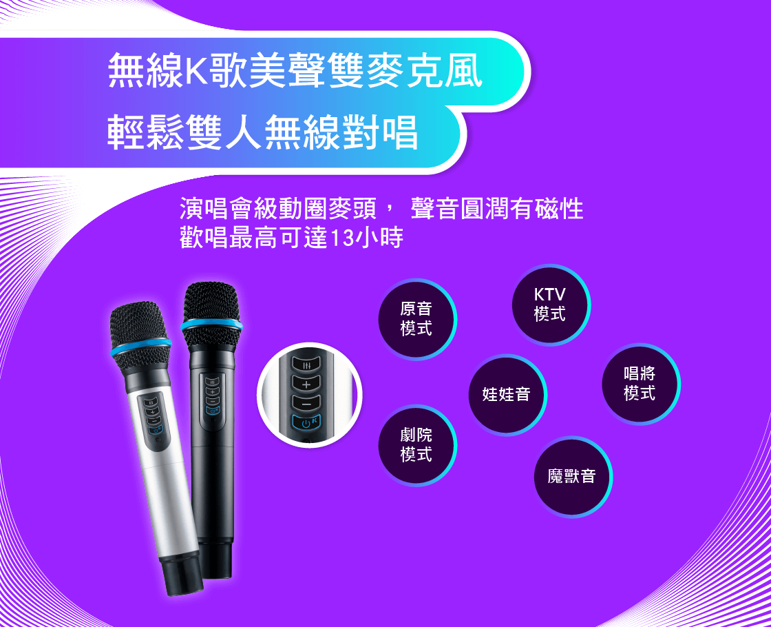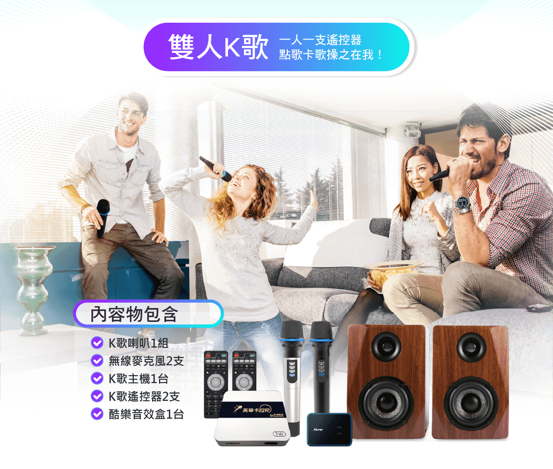 (因系統整合關係,無線麥克風加購組僅限於超值有線組加購,再請您特別留意,謝謝)。⚠️ 四人歡唱組爲兩隻無線評分麥克風,兩隻有線歡唱麥克風。