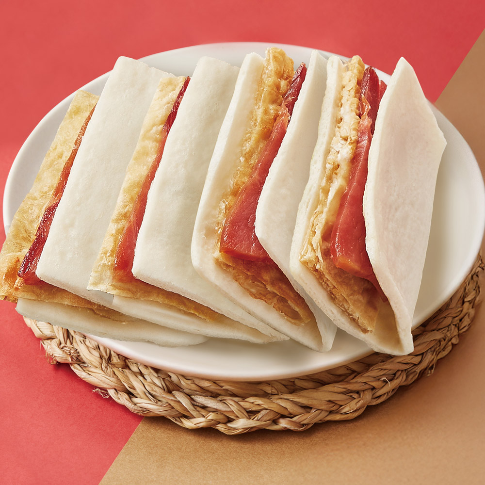 內容物成分: 蜜汁火腿:豬肉(原產地:台灣)、糖、水、鹽、鮮紅素(氯化鈉、亞硝酸鈉)。 烤方:豆皮(黃豆(使用非基因改造黃豆)、水、分離大豆蛋白(使用非基因改造大豆)、甘油、檸檬酸、碳酸氫鈉、豆類消泡劑(脂肪酸甘油酯、卵磷脂、碳酸鎂、矽樹脂)、多磷酸鈉、偏磷酸鉀、食用鹽)、麵粉、豬肉(原產地:台灣)、大豆沙拉油、鹽、糊精、蝦、L-麩酸鈉、琥珀酸二鈉、葡萄糖。 四方餅:麵粉、發粉(酸性焦磷酸鈉、碳酸氫鈉、玉米澱粉(使用非基因改造玉米)、磷酸二氫鈣)、酵母(酵母、卵磷脂(大豆提煉))、豬油(原產地:台灣)、糖、黃豆粉(使用非基因改造黃豆)、水、大豆沙拉油。