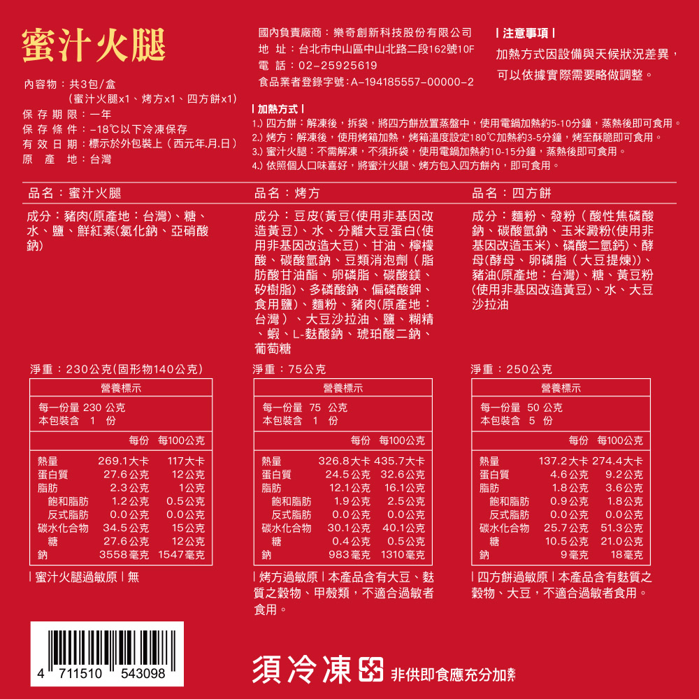 過敏原資訊: 蜜汁火腿:無。 烤方:本產品含有大豆、麩質之穀物、甲殼類,不適合過敏者食用。 四方餅:本產品含有麩質之穀物、大豆,不適合過敏者食用。