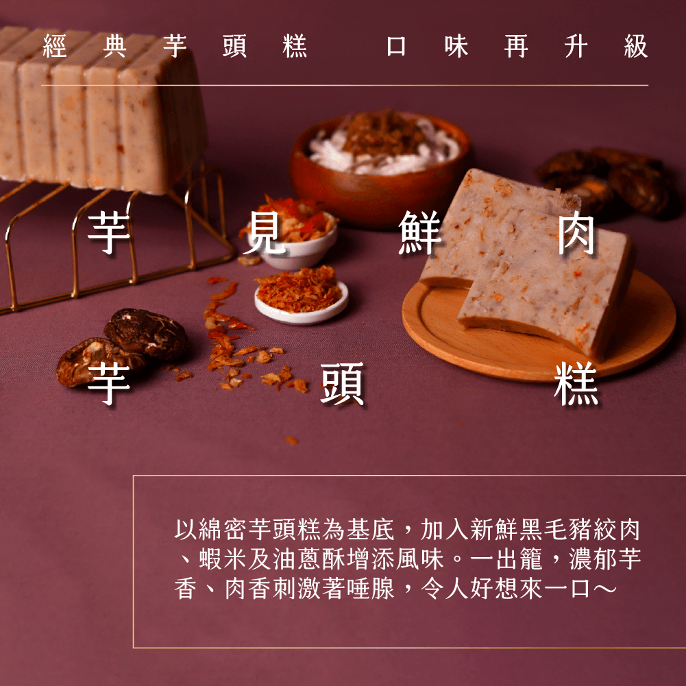 無論你是想買份應景的年節糕點,或是喜愛經典台式芋頭糕的粿粉,還有無肉不歡的芋頭控們都歡迎光臨,快來芋見鮮肉吧!