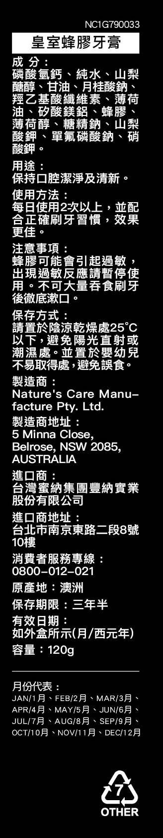 內含:【Nature’s Care 豐纳康】皇室蜂膠牙膏
