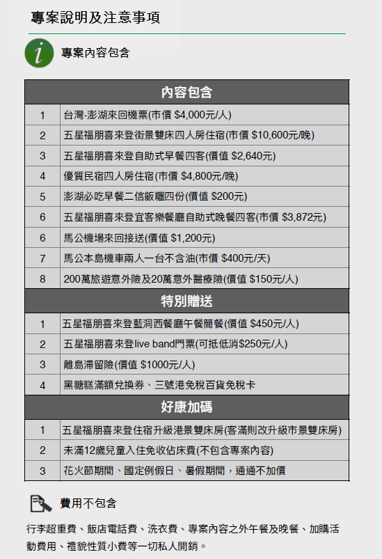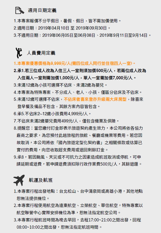 4、本方案為優惠機/船票專案,限定當天當班次有效,不得更改航班日期、班次及旅客姓名。