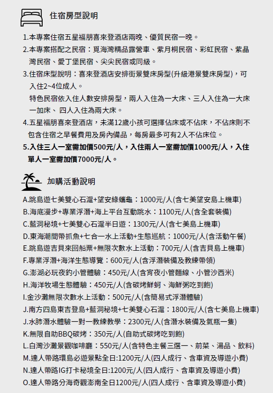 4.本專案為特殊專案,不分成⼈、老⼈、小孩,僅區分佔床及不佔床。