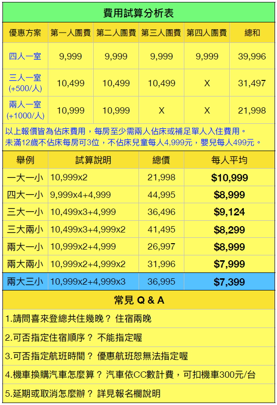 1.本專案優惠價格為9,999元/人(需四位成⼈同⾏並住宿四⼈一室)。