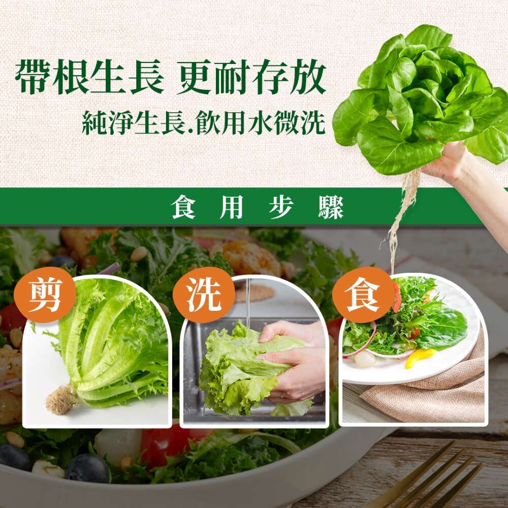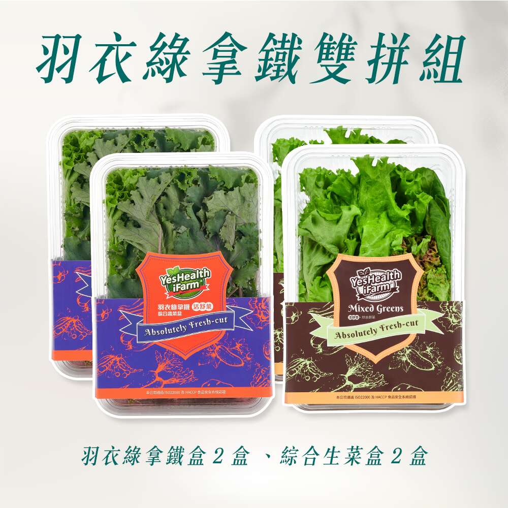 規格 :羽衣綠拿鐵盒180g±10%/盒(翠綠羽衣甘藍、紫鑽羽衣甘藍、義大利綠精靈)、綜合蔬菜盒180g±10%/盒(4種萵苣、2種香料)