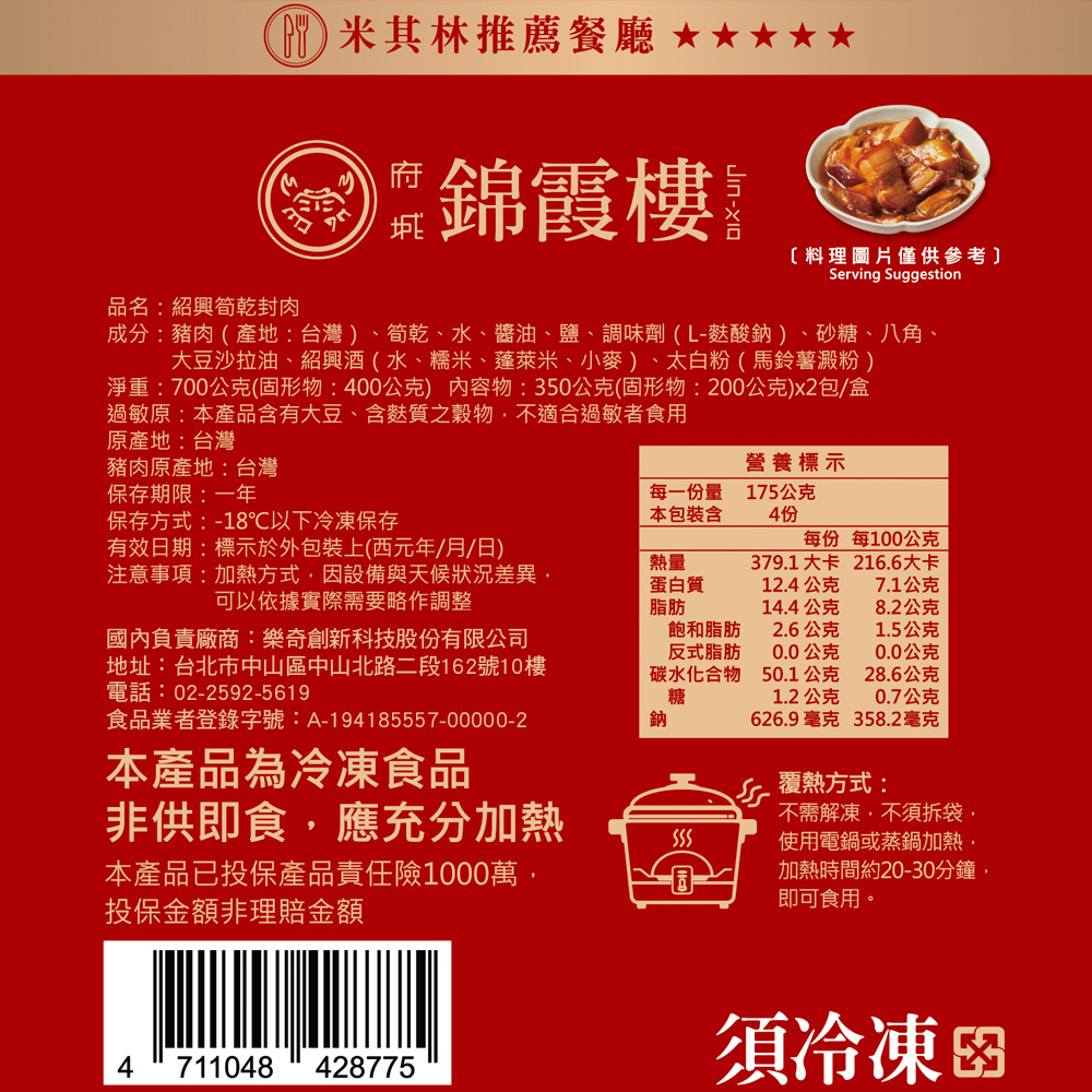 產品名稱: 【錦霞樓】紹興筍乾封肉禮盒-350g(固形物200g)/2入