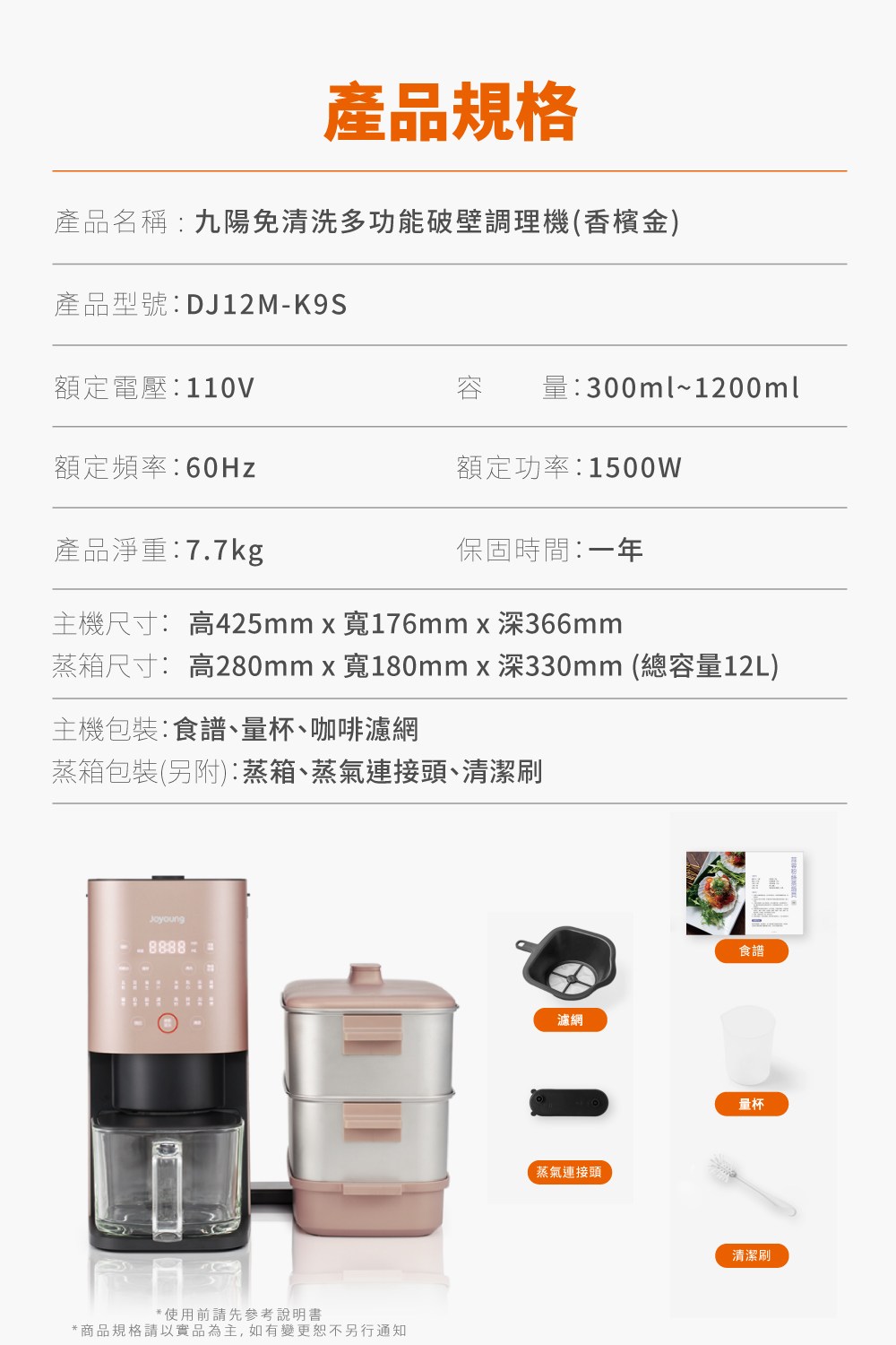贈品:九陽免清洗調理樣專用不鋼蒸箱(香檳金) K9SS(C)x 1