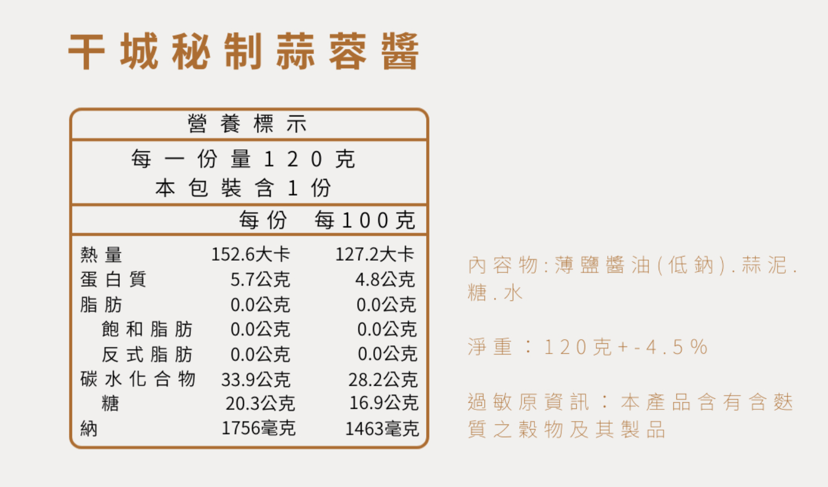 內容物:薄鹽醬油(低鈉)、蒜泥、糖、水