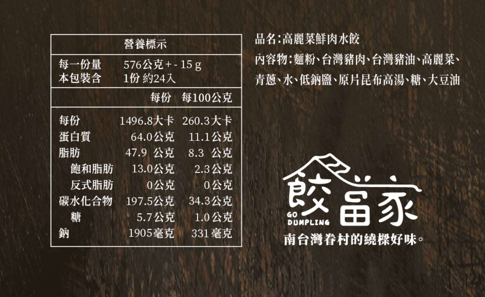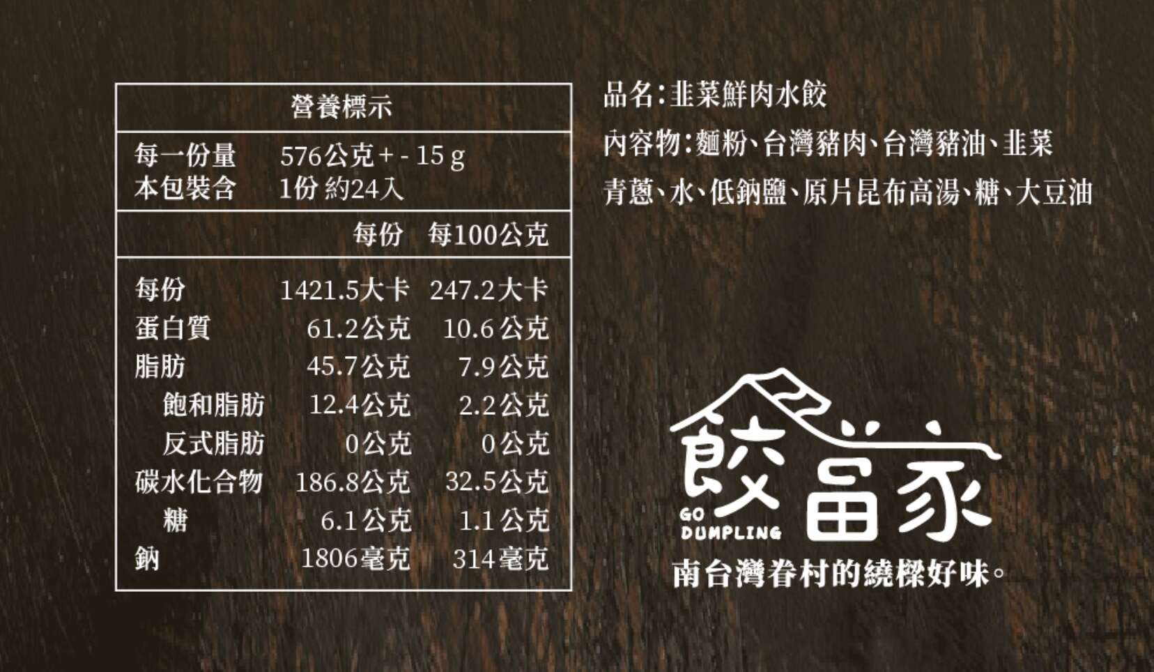 內容物:麵粉、台灣豬肉、台灣豬油、韭菜、青蔥、水、低鈉鹽、原片昆布高湯、糖、大豆油