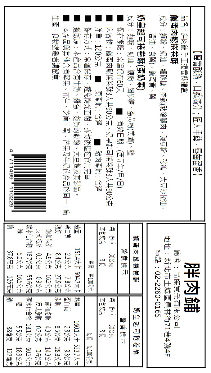 | 成分: | 鹹蛋肉鬆捲卷酥:麵粉、奶油、細砂糖、肉鬆(豬後腿肉、碗豆粉、砂糖、大豆沙拉油、醬油、食鹽)、鹹蛋黃、鹽 奶皇起司捲卷酥:麵粉、奶油、糖粉、細砂糖、蛋黃粉、鹽 |