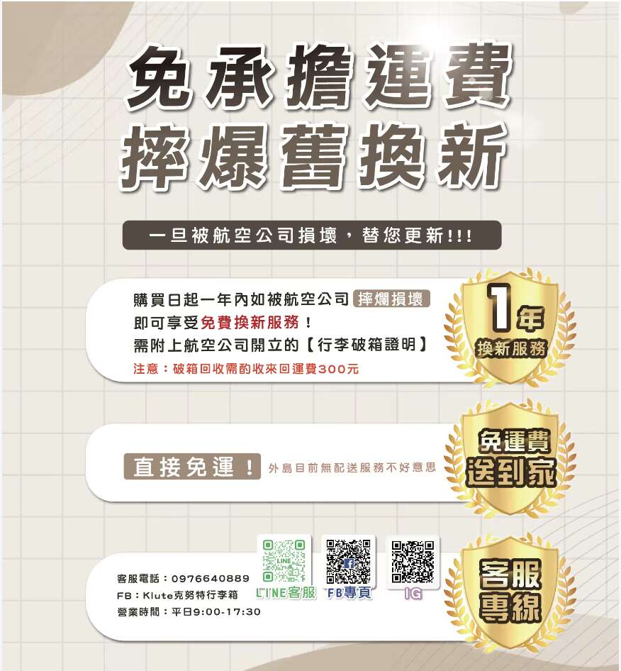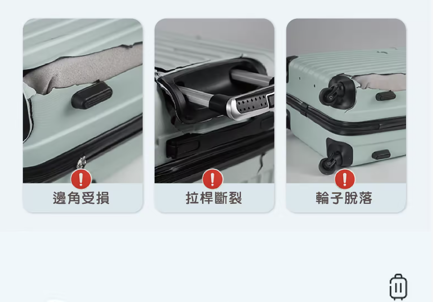 即日起一年內如被航空公司摔壞毀損,即可享受免費換新服務!