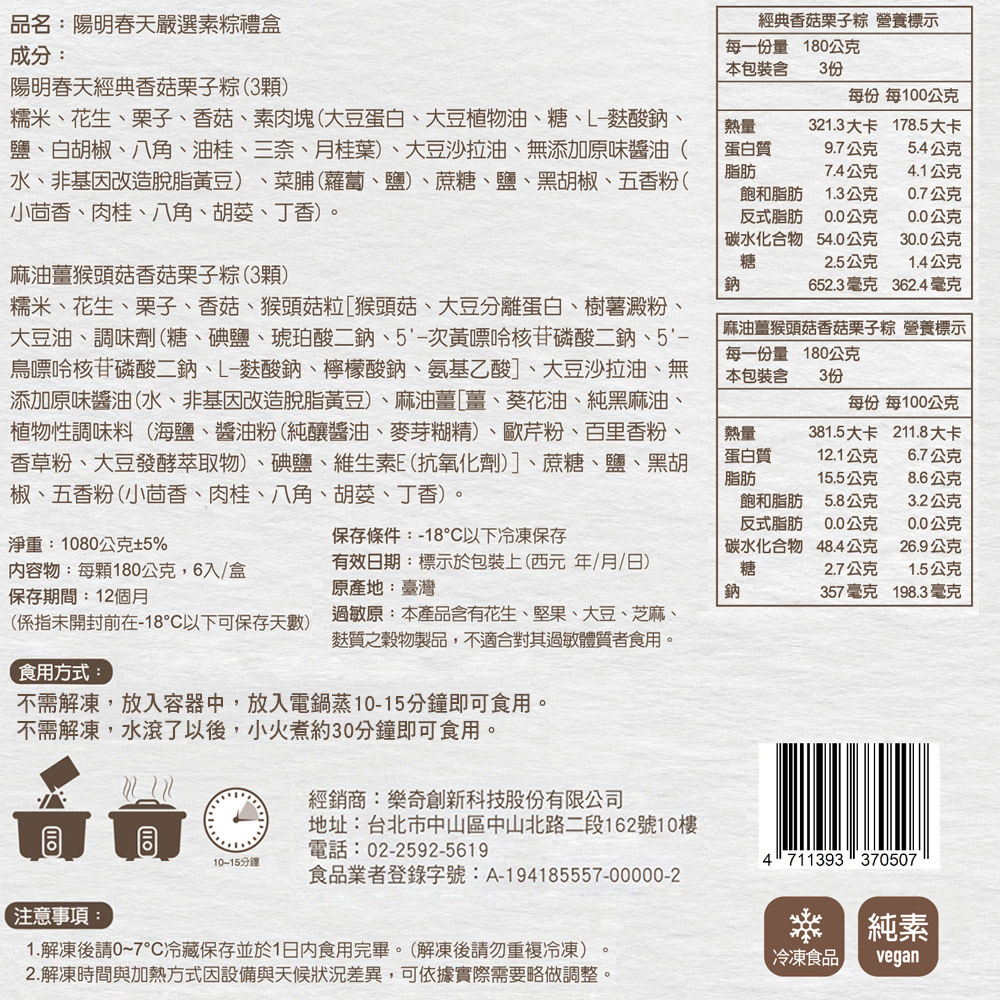 內容物成分: 經典香菇栗子粽: 糯米、花生、栗子、香菇、素肉塊(大豆蛋白、大豆植物油、糖、L-麩酸鈉、鹽、白胡椒、八角、油桂、三奈、月桂葉)、大豆沙拉油、無添加原味醬油(水、非基因改造脫脂黃豆)、麻油薑、蔗糖、鹽、黑胡椒、五香粉(小茴香、肉桂、八角、胡荽、丁香)。 麻油薑猴頭菇香菇栗子粽: 糯米、花生、栗子、香菇、猴頭菇粒[猴頭菇、大豆分離蛋白、樹薯澱粉、大豆油、調味劑(糖、碘鹽、琥珀酸二鈉、5'-次黃嘌呤核苷磷酸二鈉、5'-鳥嘌呤核苷磷酸二鈉、L-麩酸鈉、檸檬酸鈉、氨基乙酸]、大豆沙拉油、無添加原味醬油(水、非基因改造脫脂黃豆)、麻油薑[薑、葵花油、純黑麻油、植物性調味料 (海鹽、醬油粉(純釀醬油、麥芽糊精)、歐芹粉、百里香粉、香草粉、大豆發酵萃取物)、碘鹽、維生素E(抗氧化劑)]、蔗糖、鹽、黑胡椒、五香粉(小茴香、肉桂、八角、胡荽、丁香)。