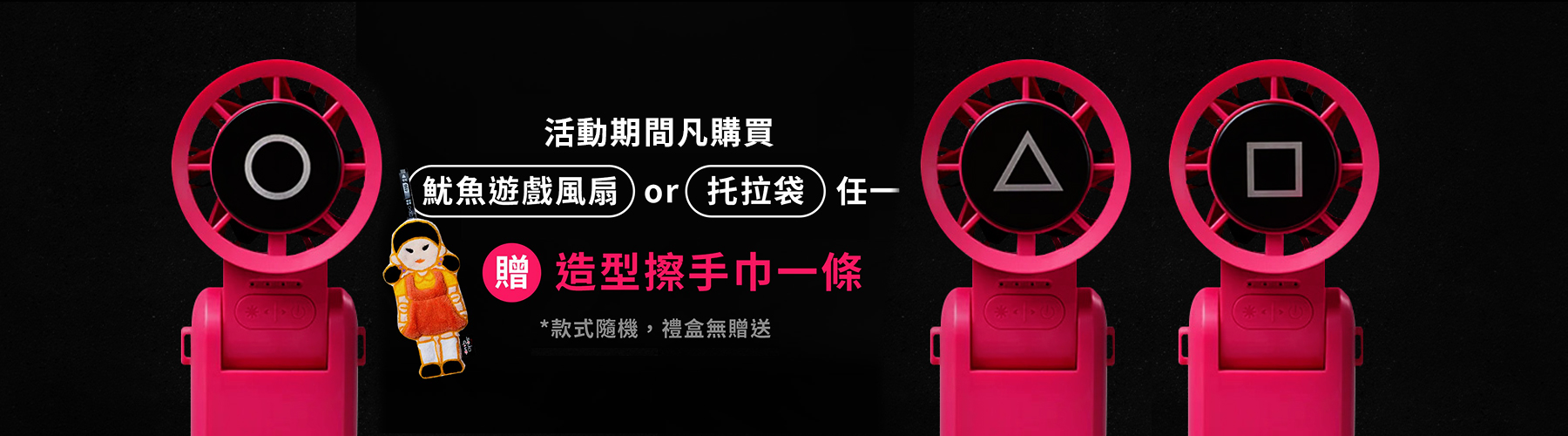 凡購買魷魚遊戲[拖輪袋]或[製冷風扇],隨貨贈魷魚遊戲造型擦手巾一組