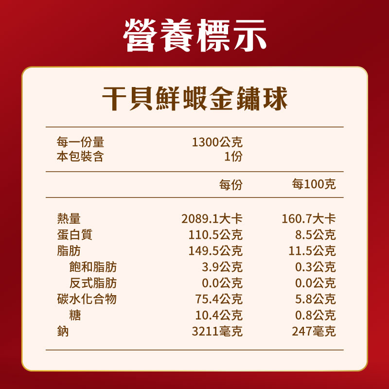 內含:【小灶堂】干貝鮮蝦金鏽球 1300g *1