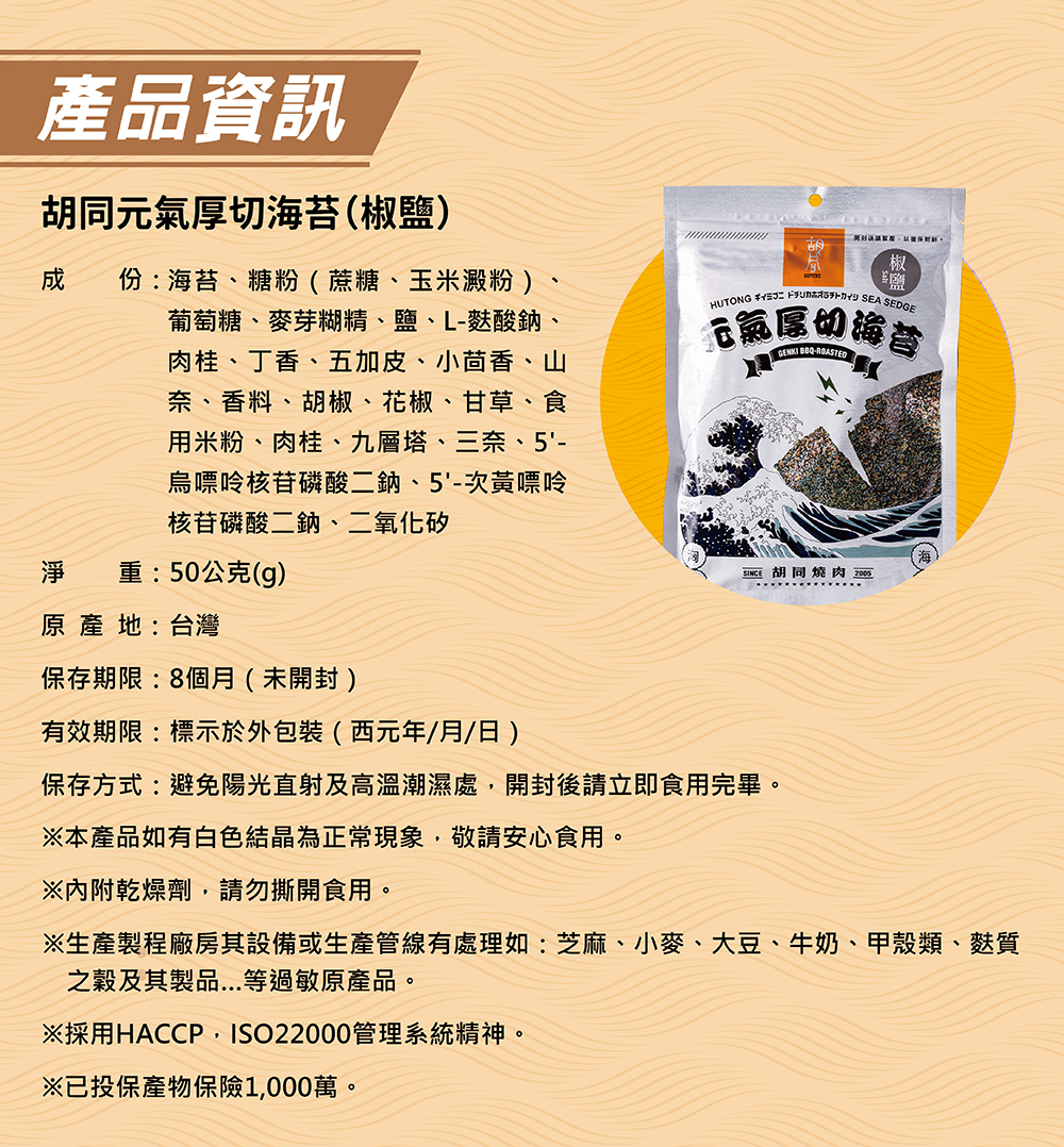 成分:海苔、糖粉(麻糖、玉米澱粉)、葡萄糖、麥芽糊精、鹽、L-麩酸鈉、肉挂、丁香、五加皮、小茴香、山奈、香料、胡椒、花椒、甘草、食用米粉、肉桂、九層塔、三奈、5‘-烏嘌呤核苷磷酸二鈉、5'-次黃嘌呤核苷磷酸二鈉