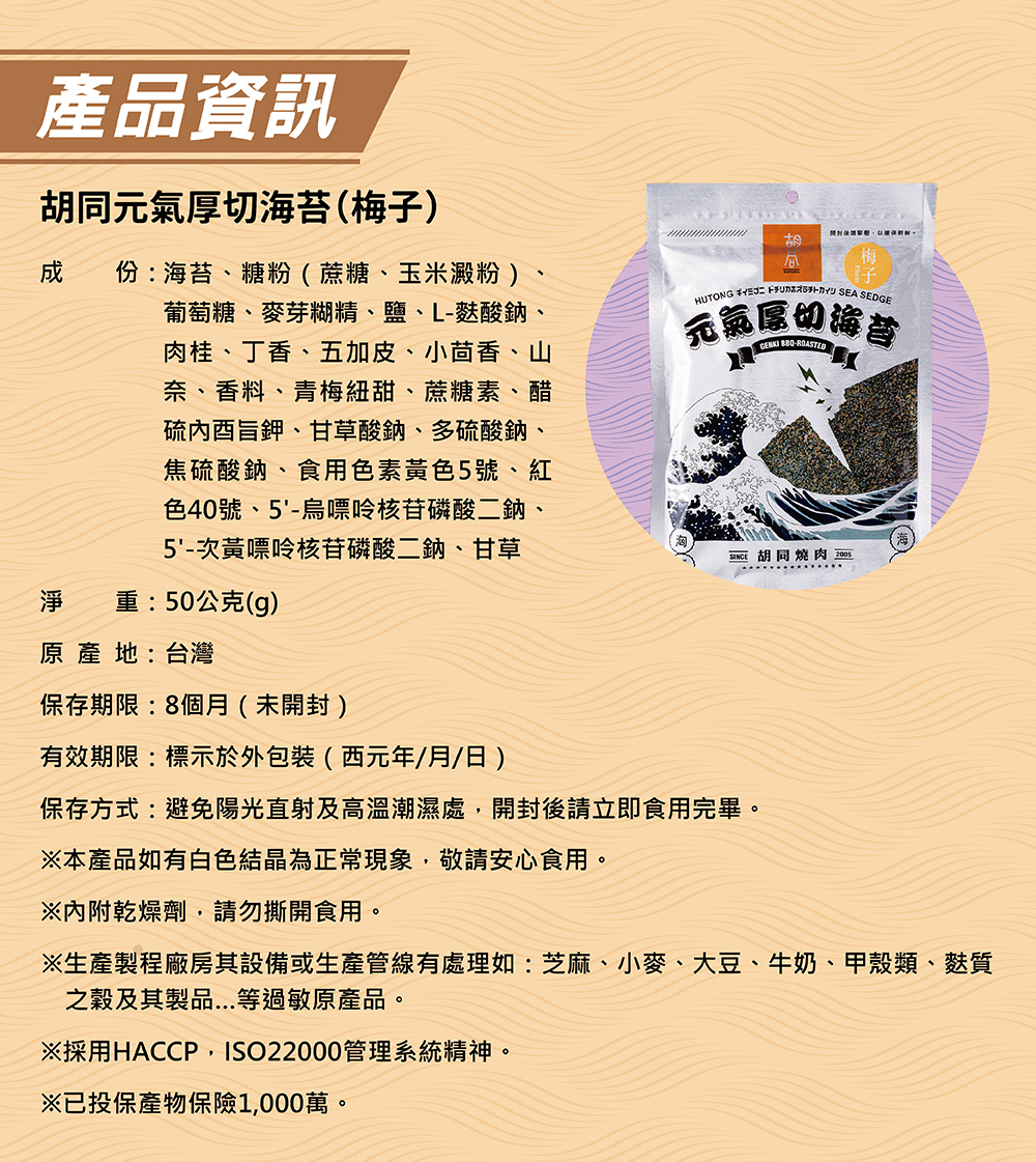 成分:海苔、糖粉(麻糖、玉米澱粉)、葡萄糖、麥芽糊精、鹽、L-麩酸鈉、肉挂、丁香、五加皮、小茴香、山奈、香料、青梅、紐甜、蔗糖素、醋硫內酉旨鉀、甘草酸鈉、多硫酸鈉、焦硫酸鈉、食用色素黃色5號、紅色40號、5‘-烏嘌呤核苷磷酸二鈉、5'-次黃嘌呤核苷磷酸二鈉、甘草