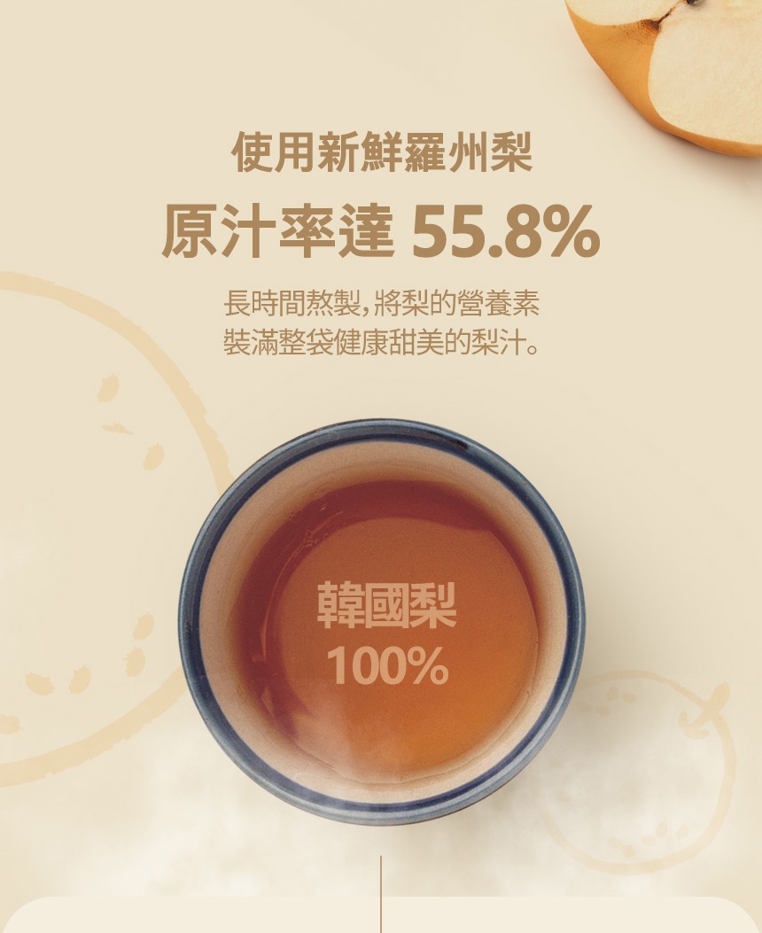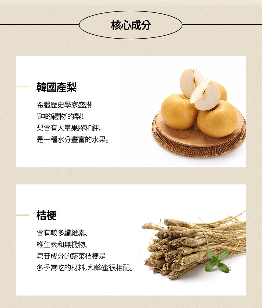 原料:梨混合提取物 [固體成分含量10%以上](梨、水、草石蠶根、桔梗萃取物、生薑、甘草根、棗、蜂蜜)