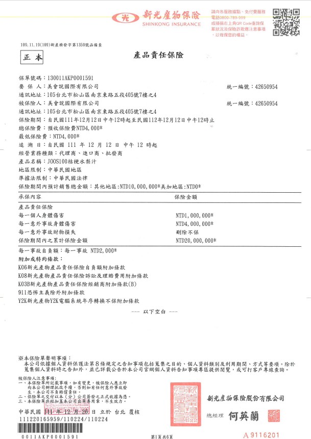 投保產品責任險字號:130011AKP0001591