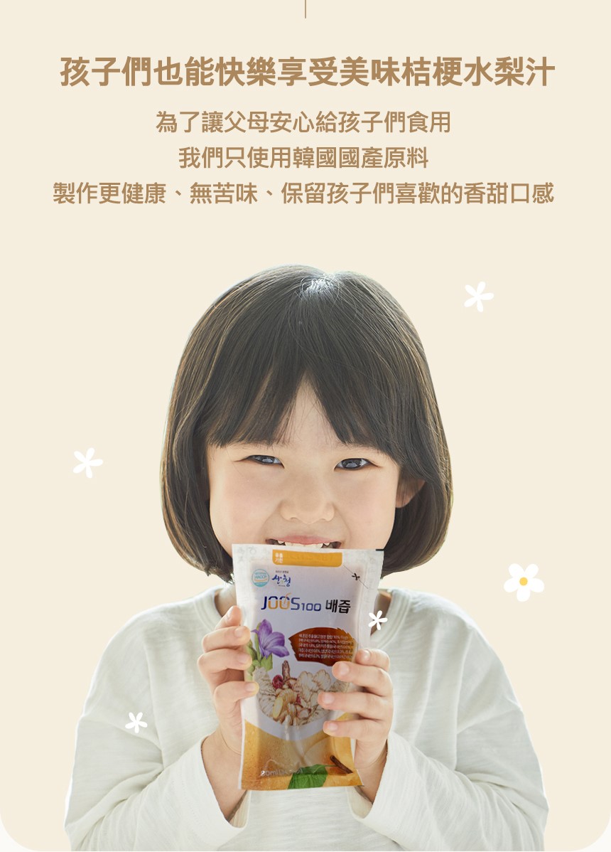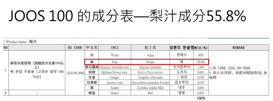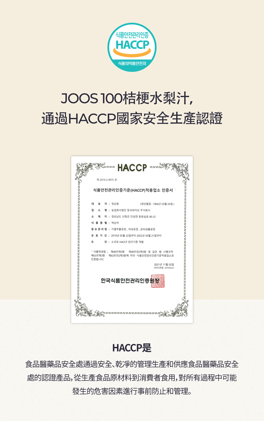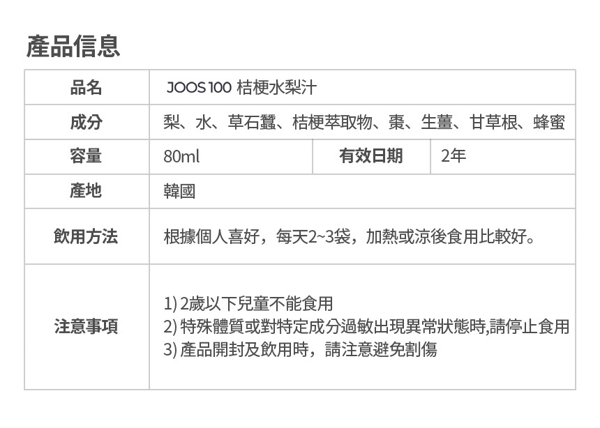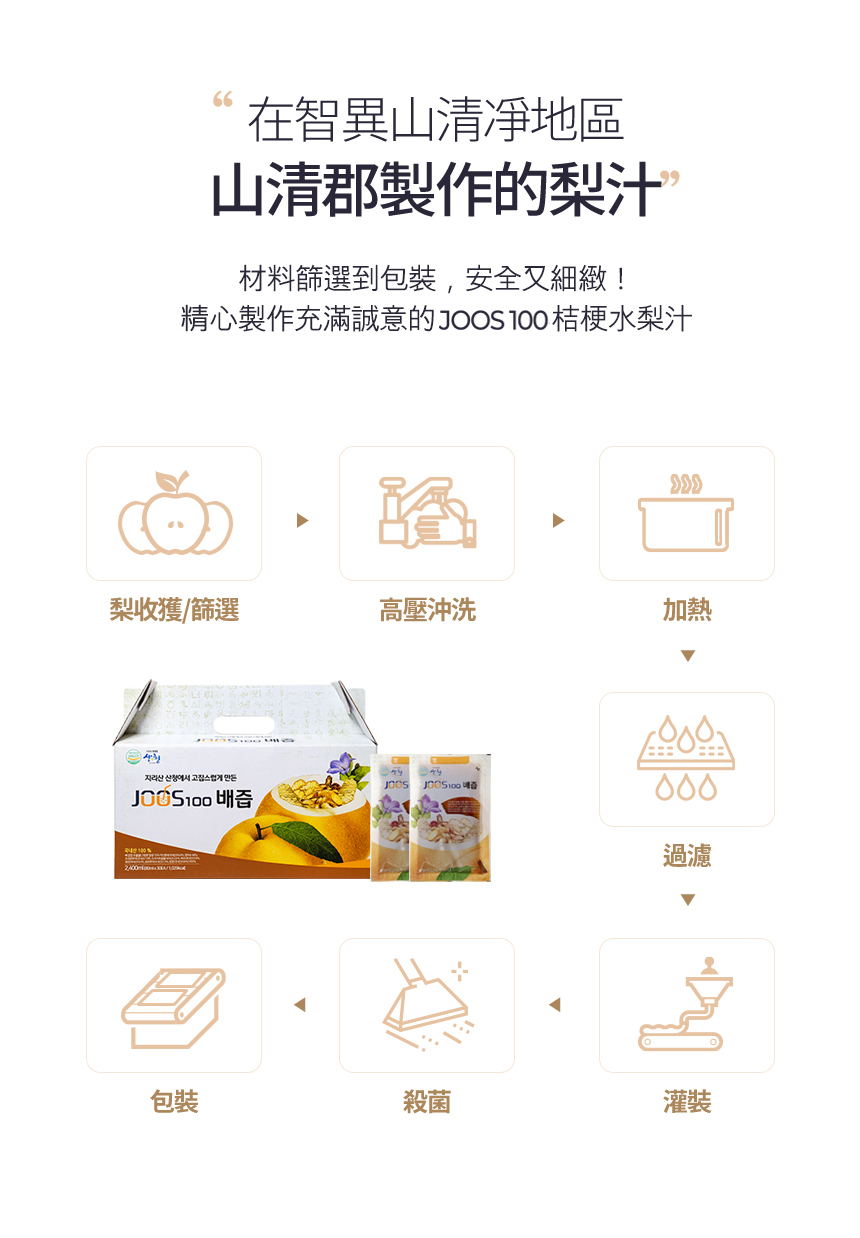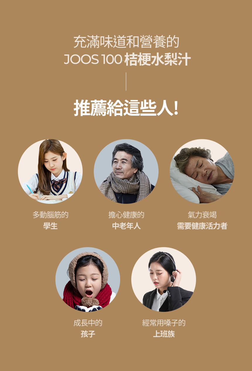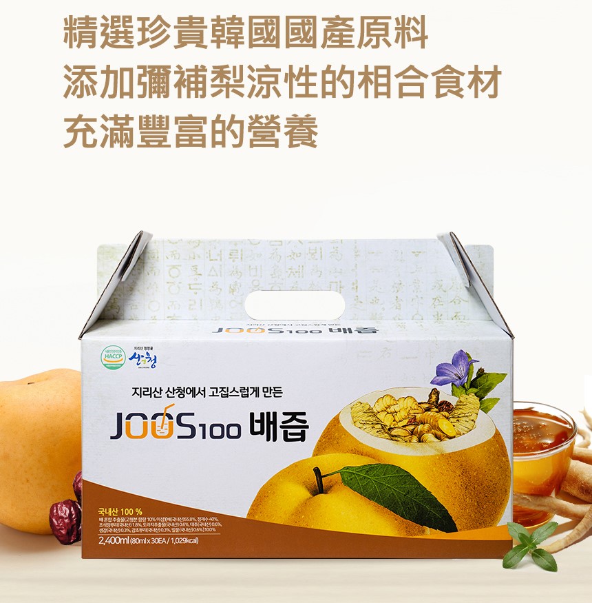 韓國東醫生命(株)_公司,針對現代人生活節奏急速,長期熬夜倒,外食頻繁、應酬過多,常吃煎炸食物,造成喉乾肺燥。將韓國百年傳承的技藝,透過現代化設備,符合最高食安等級規範,經歷慢火細熬、收取梨汁、過濾沉澱、選取精華、冷卻調和、降溫處理等十餘個步驟,推出 JOOS 100桔梗水梨汁成為大家的日常保養品。