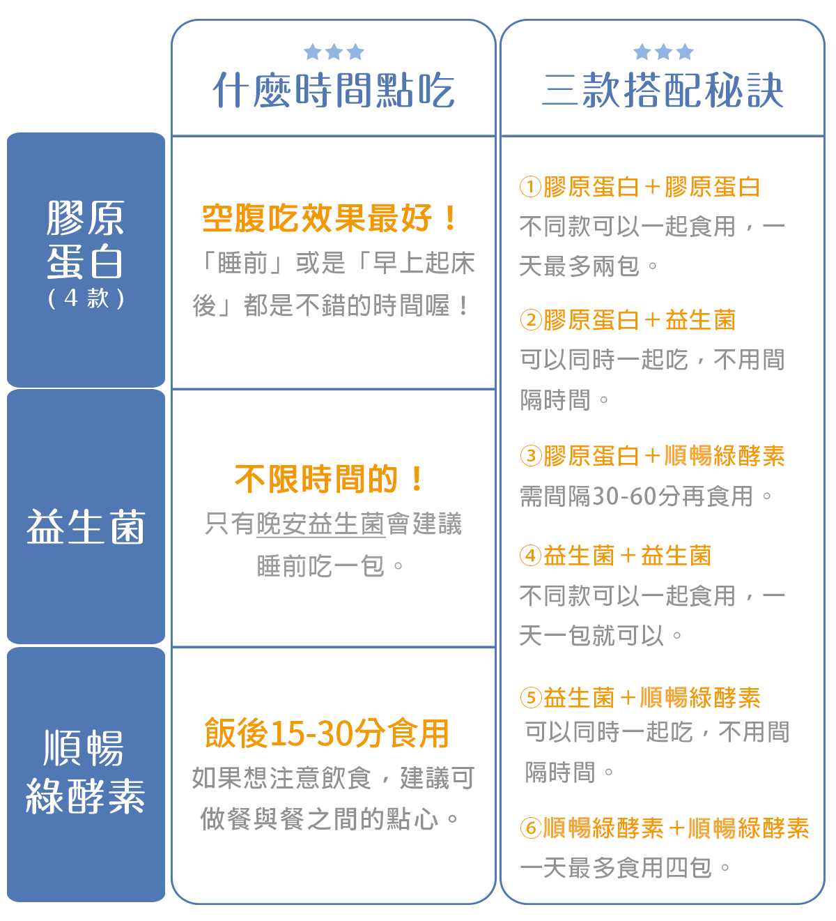 3.每日食用請勿超過4包,請遵循建議食用量,多食無益。