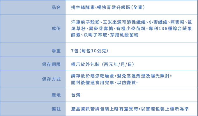 洋車前子殼粉、玉米來源可溶性纖維、小麥纖維、燕麥粉、鼠尾草籽、異麥芽寡糖、有機小麥苗粉、專利VF-136種綜合蔬果酵素(諾麗果、哈密瓜、茄子、苦瓜、冬瓜、紅蘿蔔、南瓜、馬鈴薯、胡瓜、絲瓜、小黃瓜、秋葵、青花椰菜、地瓜葉、地瓜、空心菜、芹菜、西洋芹、筊白筍、玉米、大白菜、菠菜、芥藍、小白菜、青江菜、黑豆、菜豆、敏豆、莧菜、黃豆芽、高麗菜、牛蒡、山藥、老薑、甜椒、青椒、紅鳳菜、A菜、巴西栗、檸檬、鳳梨、葡萄、番茄、青木瓜、梅子、蘋果、柚子、葡萄柚、柳丁、椪柑、甜橙、百香果、番石榴、棗子、紅棗、甜菜根、桑葚、李子、紅龍果、荔枝、龍眼、桃子、蓮霧、香菇、金針菇、黑木耳、草莓、藍莓、芒果、水蜜桃、青蘋果、蔓越莓、西印度櫻桃、水梨、白葡萄、康科特葡萄、山竹、枸杞、山桑子、黑醋栗、野櫻桃、酸櫻桃、余甘子、石榴、接骨木果、黑覆盆子、紅覆盆子、螺旋藻、綠藻、蕁麻、小麥草、大麥草、猴頭菇、迷你胡蘿蔔、香芹、羽衣甘藍、靈芝、舞茸、椎茸、巴西蘑菇、花椰菜芽、義大利鑽石花椰菜、羽衣甘藍菜芽、花椰菜、紅甘藍菜、紫甘藍菜、球花甘藍、澱粉酵素、木瓜酵素、蛋白酵素、脂肪酵素、橘子、木瓜、香蕉、萊姆、黃瓜、洋梨、荷蘭芹、萵苣、羅勒、玉米鬚、九層塔、大麥苗粉、小麥苗粉、小米草萃取物、小米萃取物、山楂果、西洋參、當歸、熟地、白芍、川芎、人蔘、桂圓、黑棗、奇異果)、決明子萃取、芽孢乳酸菌粉