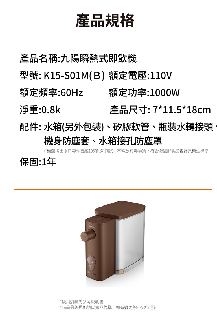 內含:【JOYOUNG 九陽】Line Friends系列瞬熱式即飲機K15-S01M(熊大款 莎莉款)