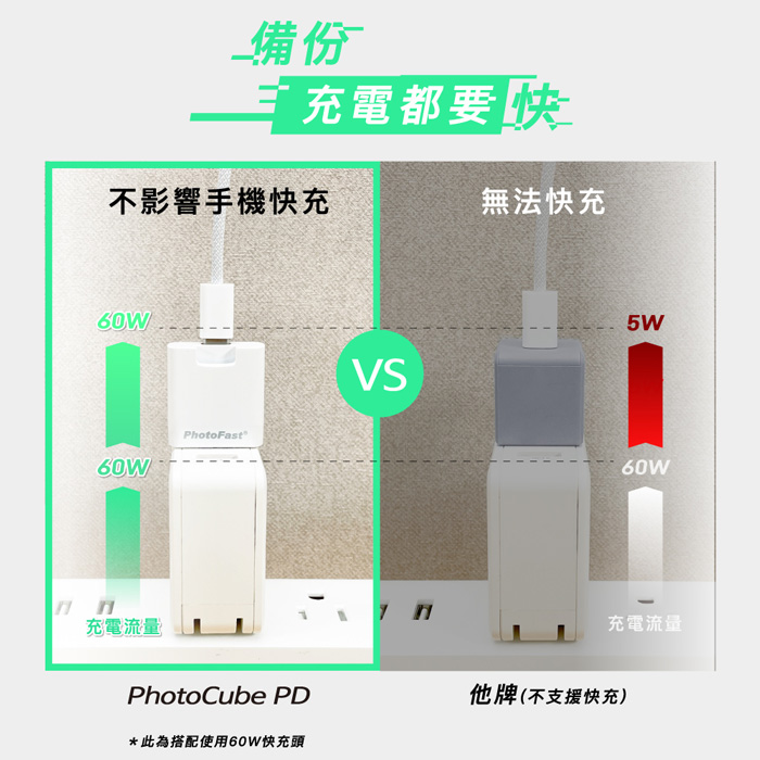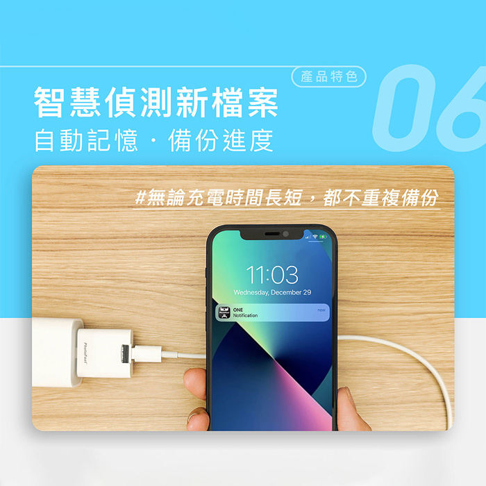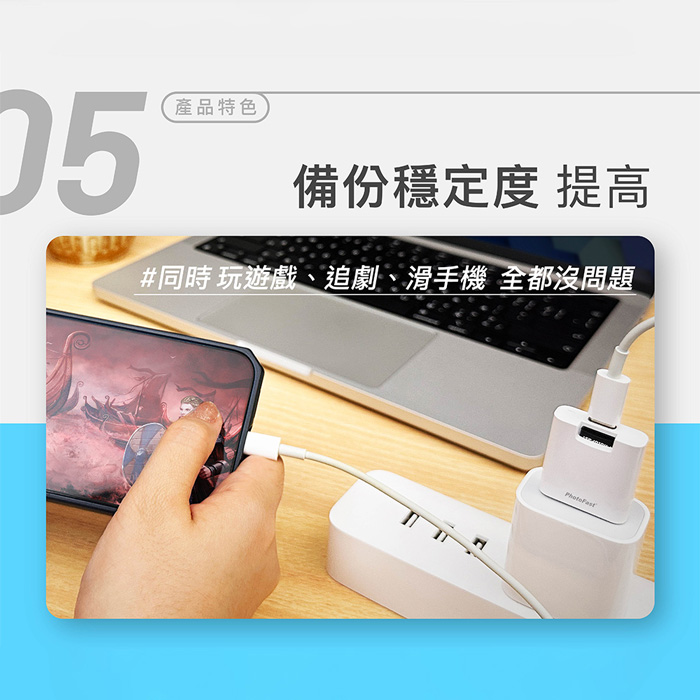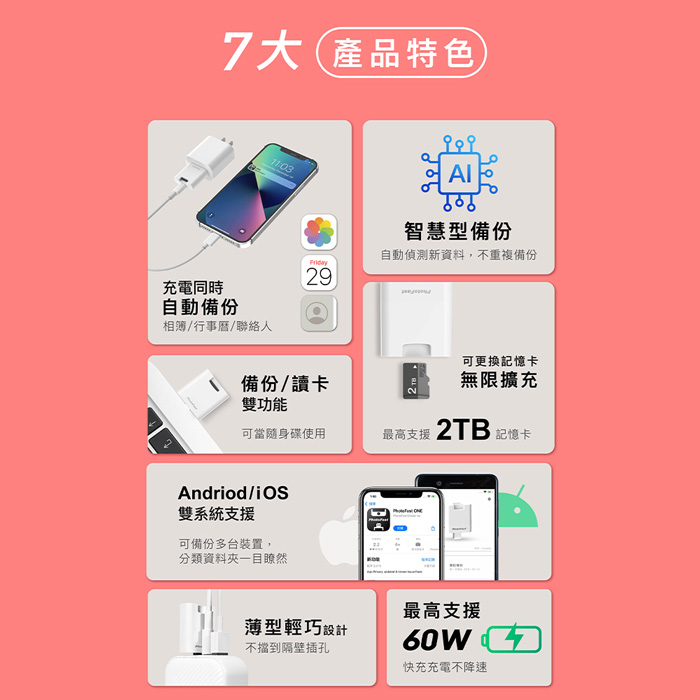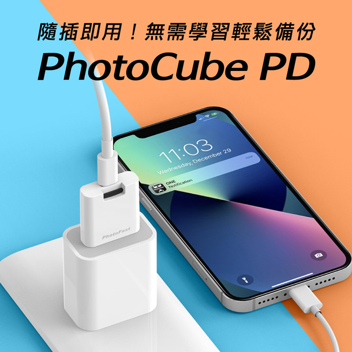 請參閱上方的教學影片,下載及設定完成《 PhotoFast ONE 》APP,並將 MicroSD 記憶卡插入備份神器中,將備份神器連接5V USB充電器或豆腐頭,再插上充電線,就可以讓手機充電同時自動完成備份囉!