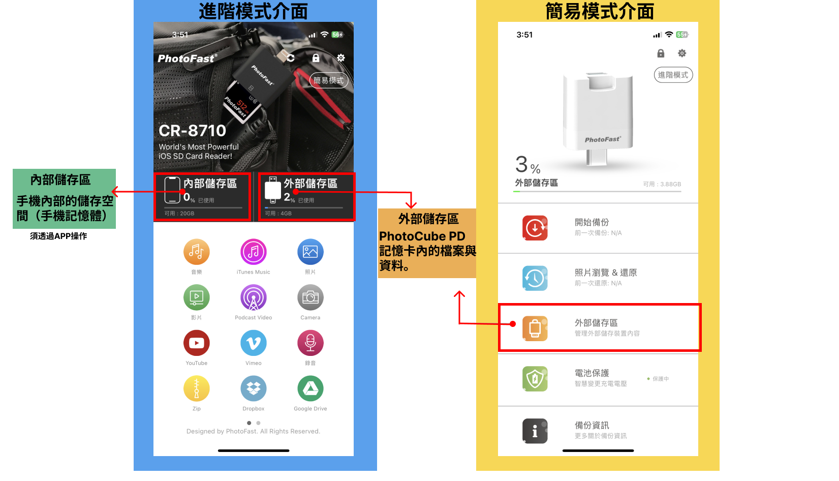 外部儲存區:指PhotoCube PD裡『記憶卡』內的資料。