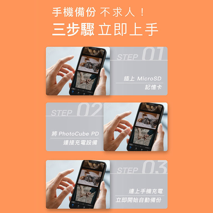 使用請先下載《 PhotoFast ONE 》APP 後,並照著指示開啟 『允許』手機權限預設自動備份聯絡人、行事曆、相簿,設定完成後,下次充電時就會自動跑備份程序,也不需要解鎖手機。( 您亦可隨時手動關閉自動備份功能 )