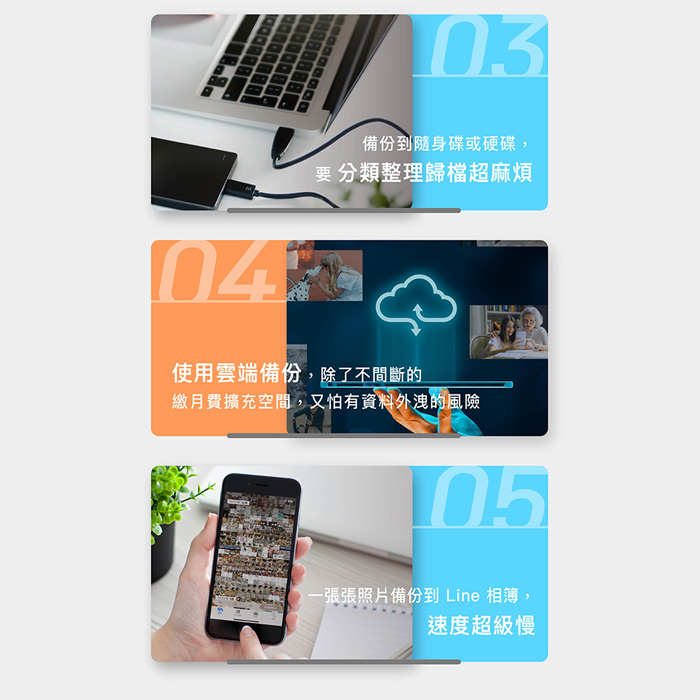 通常雲端備份都需要網路,有時候 WIFI 訊號的強弱會影響備份的速度,也會有個資外洩疑慮,相對備份方塊便利好攜帶,且簡單容易使用,只要插電就能同時兼顧備份及充電,資料也會自動按年份、月份區分,不需手動歸檔分類,若家中有多支手機,備份時也會以手機區分資料夾,iPhone 和 Android 手機平板都能使用喔!