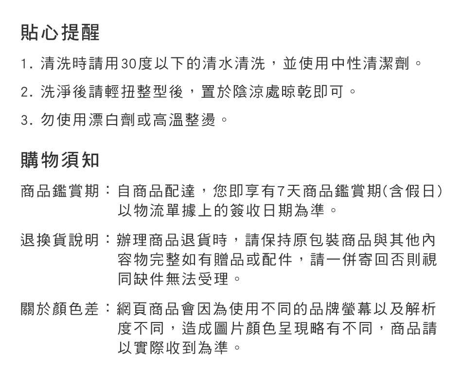 如果您所購買的商品是屬於易於腐敗之商品、保存期限較短之商品、客製化商品、報紙、期刊、雜誌,依據消費者保護法之規定,於收受商品後將無法享有七天猶豫期之權益且不得辦理退貨。