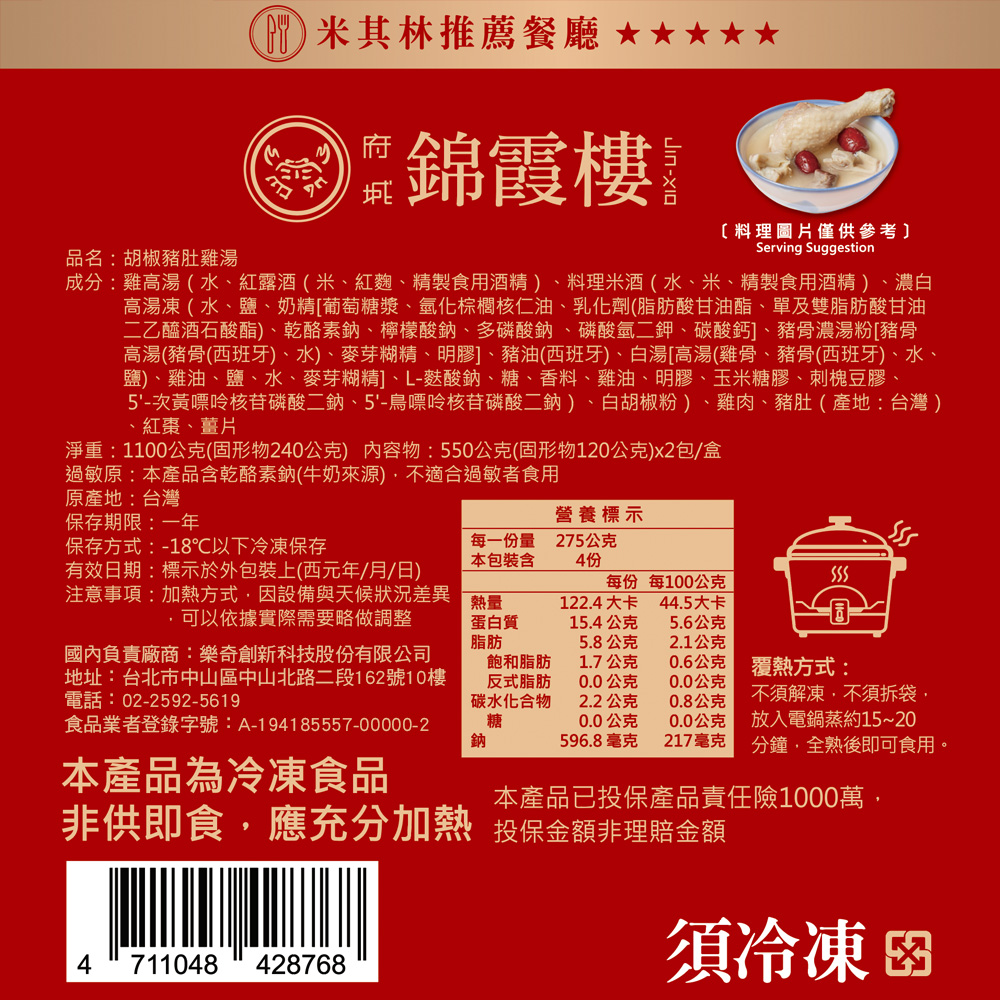 產品名稱: 【錦霞樓】胡椒豬肚雞湯禮盒-550g(固形物120g)/2入