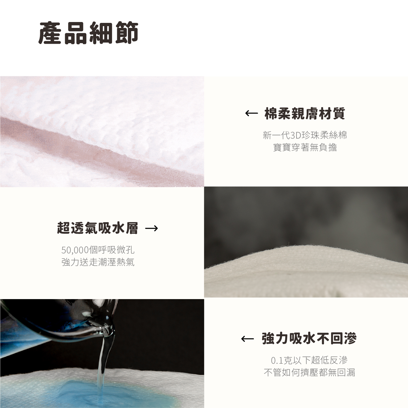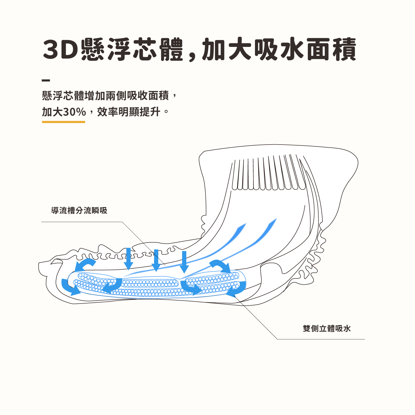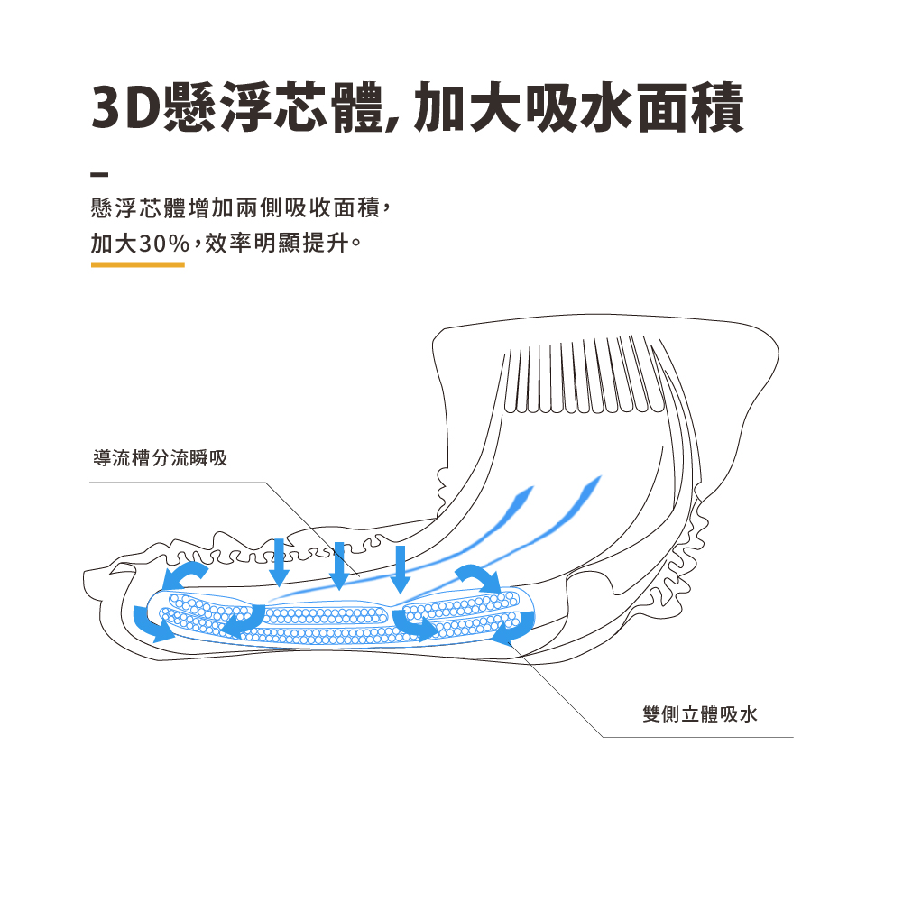 ✓ 3D懸浮芯結構、加大兩側吸水面積