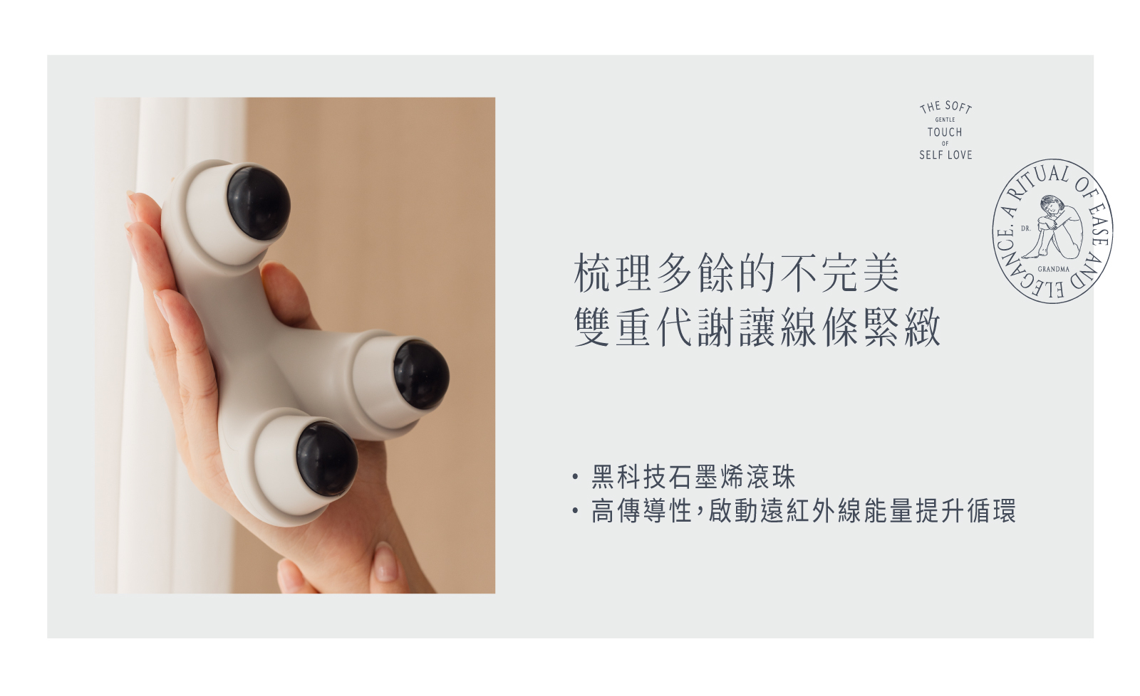 這次改版,加強了石墨烯滾珠按摩儀的滾珠,不僅加大讓按摩過程更好施力、加壓不費力外,滾珠添加黑科技石墨烯和遠紅外線成分,加強肌膚循環、舒緩效果再提升。