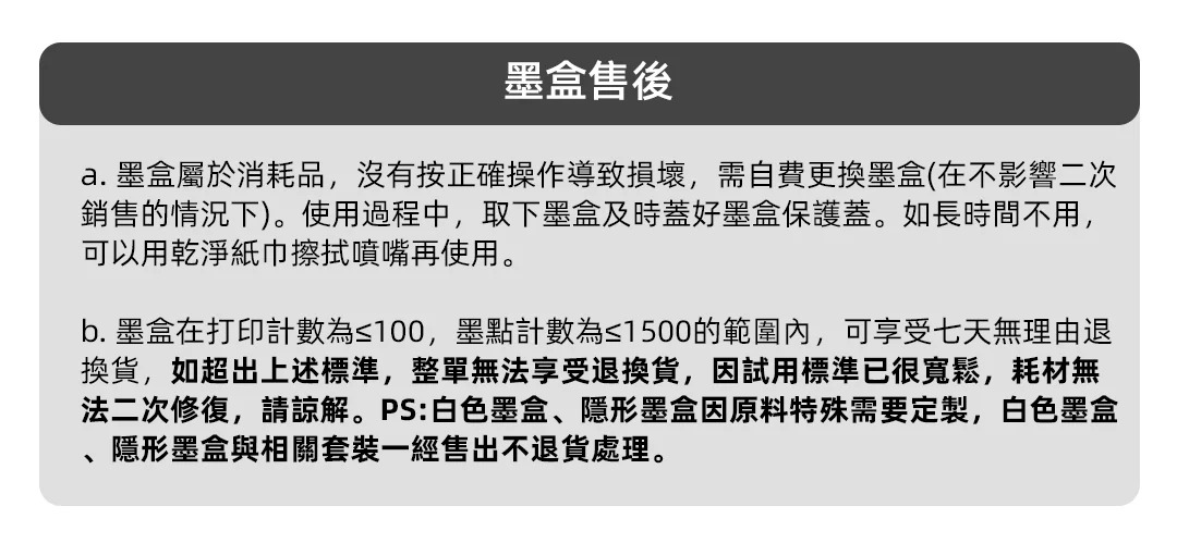 注意事項: 白色墨盒售出不退換