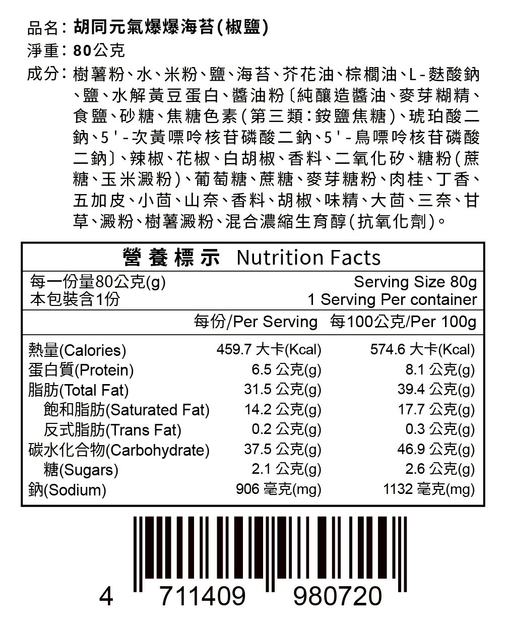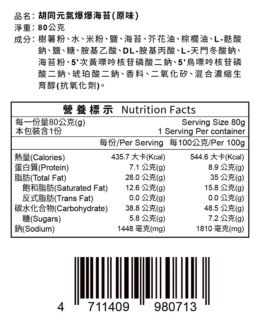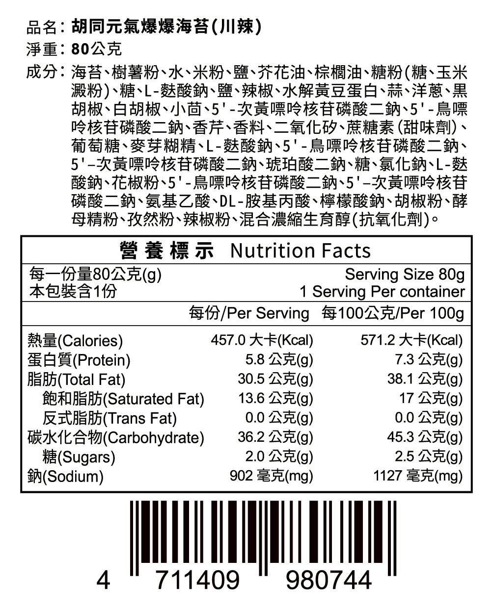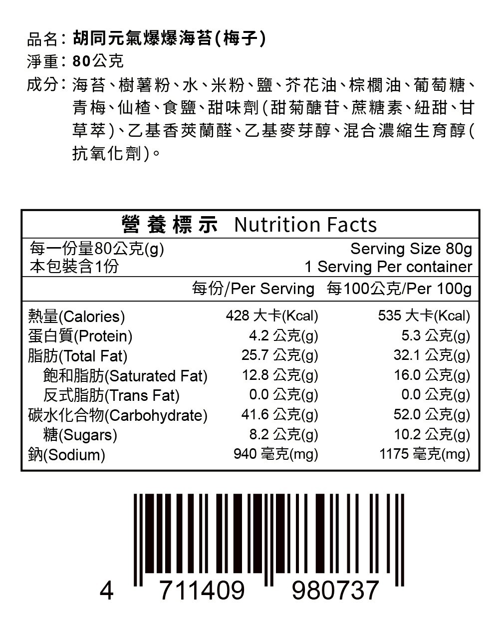 內容物成分: 品名:胡同元氣爆爆海苔(梅子) 成分:海苔、樹薯粉、水、米粉、鹽、芥花油、棕櫚油、葡萄糖、青梅、仙楂、食鹽、甜味劑(甜菊醣苷、蔗糖素、紐甜、甘草萃)、乙基香莢蘭醛、乙基麥芽醇、混合濃縮生育醇(抗氧化劑)。 品名:胡同元氣爆爆海苔(椒鹽) 成分: 樹薯粉、水、米粉、鹽、海苔、芥花油、棕櫚油、L-麩酸鈉、鹽、水解黃豆蛋白、醬油粉(純釀造醬油、麥芽糊精、食鹽、砂糖、焦糖色素(第三類:銨鹽焦糖)、琥珀酸二鈉、5'-次黃嘌呤核苷磷酸二鈉、5'-鳥嘌呤核苷磷酸二鈉〕、辣椒、花椒、白胡椒、香料、二氧化矽、糖粉(蔗糖、玉米澱粉)、葡萄糖、蔗糖、麥芽糖粉、肉桂、丁香、五加皮、小茴、山奈、香料、胡椒、味精、大茴、三奈、甘草、澱粉、樹薯澱粉、混合濃縮生育醇(抗氧化劑)。。 品名:胡同元氣爆爆海苔(川辣) 成分: 海苔、樹薯粉、水、米粉、鹽、芥花油、棕櫚油、糖粉(糖、玉米澱粉)、糖、L-麩酸鈉、鹽、辣椒、水解黃豆蛋白、蒜、洋蔥、黒胡椒、白胡椒、小茴、5'-次黃嘌呤核苷磷酸二鈉、5'-鳥嘌吟核苷磷酸二鈉、香芹、香料、二氧化矽、蔗糖素(甜味劑)、葡萄糖、麥芽糊精、L-麩酸鈉、5'-鳥嘌呤核苷磷酸二鈉、 5'-次黃嘌呤核苷磷酸二鈉、琥珀酸二鈉、糖、氯化鈉、L-麩酸鈉、花椒粉、5'-鳥嘌呤核苷磷酸二鈉、5'-次黃嘌呤核苷磷酸二鈉、氨基乙酸、DL-胺基丙酸、檸檬酸鈉、胡椒粉、酵母精粉、孜然粉、辣椒粉、混合濃縮生育醇(抗氧化劑)。 品名:胡同元氣爆爆海苔(原味) 成分: 樹薯粉、水、米粉、鹽、海苔、芥花油、棕櫚油、L-麩酸鈉、鹽、糖、胺基乙酸、DL-胺基丙酸、L-天門冬酸鈉、海苔粉、5'次黃嘌呤核苷磷酸二鈉、5'鳥嘌呤核苷磷酸二鈉、琥珀酸二鈉、香料、二氧化矽、混合濃縮生育醇(抗氧化劑)。